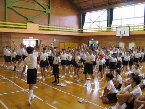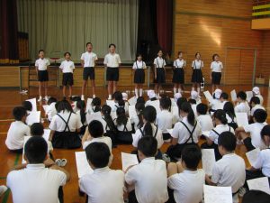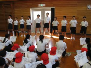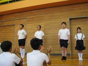 全体での話の後、赤団と白団に分かれて、「応援リーダーの自己紹介」「応援歌の説明」が行われました。各団のリーダーも「大きな声」「きびきびした動き」「下級生への的確な指示」など気合いの入った動きを見せてくれました。