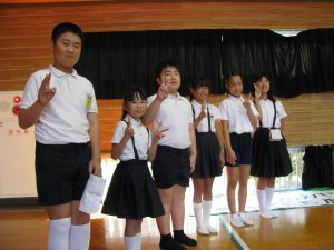 実行委員会の子ども達の気合いの入った司会進行のもと、ピリッと引き締まった雰囲気の中で、「実行委員会の自己紹介」「運動会スローガンの発表」「頑張り点の説明」が行われました。