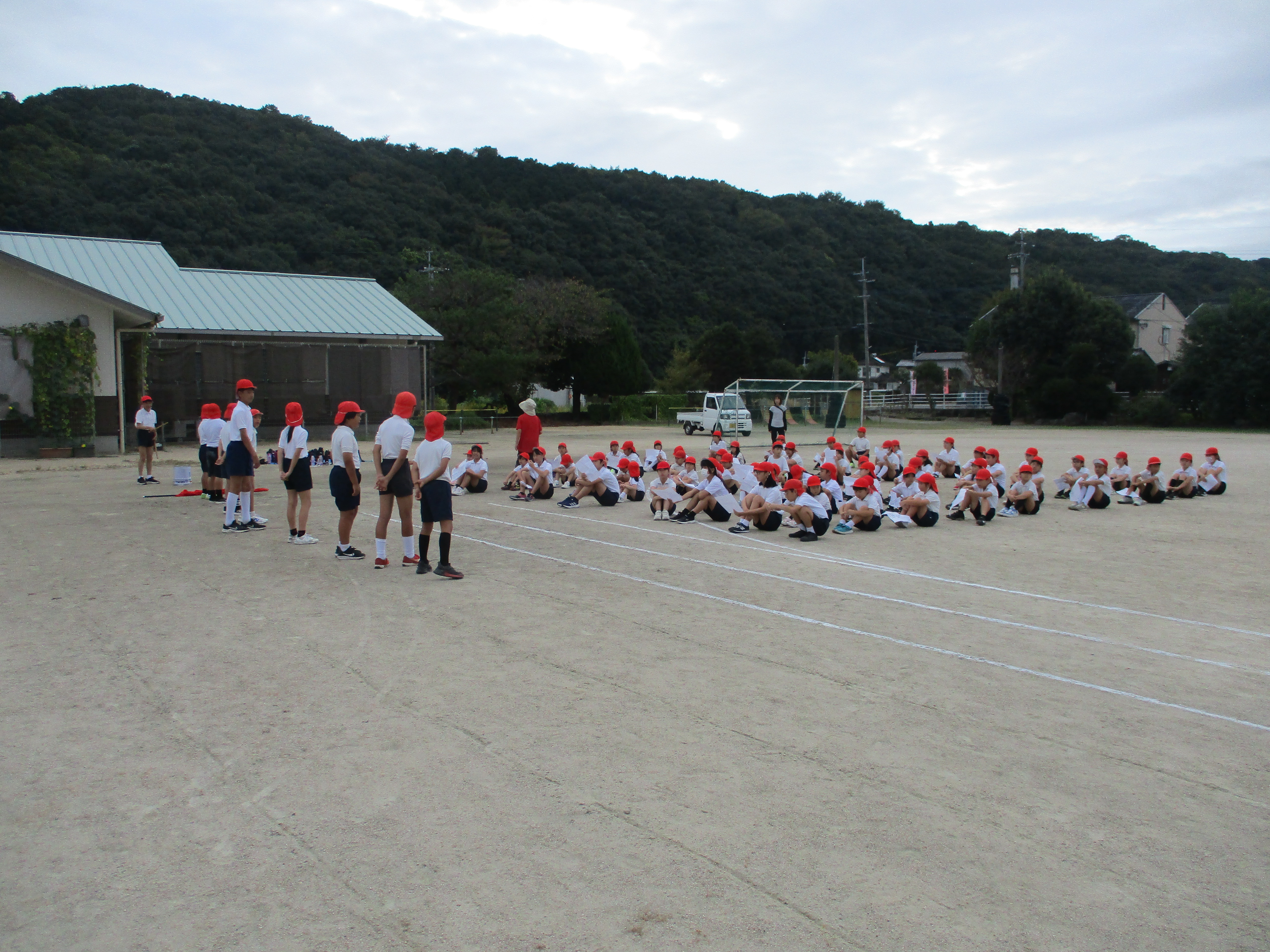 また、全体練習の前には応援練習も行われました。赤組、白組ともに、応援リーダーを中心に気合いの入った練習が行われました。白組は学年ごとに小グループに分け、応援リーダーが細かいところまで丁寧に指導する姿が見られました。赤組は全体で声を出すことを中心に練習が進められました。