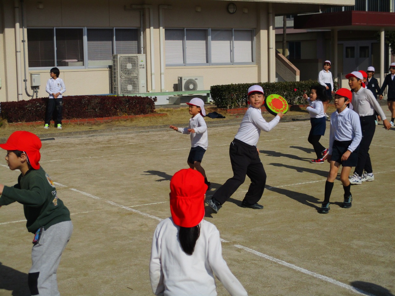 寒くなるこの季節、昼休みに全校のみんなに楽しんで体を動かしてもらいたいという思いから、運動委員会企画の「縦割り班対抗ドッジビーボール大会」が開催されました。リーグ戦で1チーム2試合ずつの予選を行い、2勝ずつしたイルカチームvsチーターチームの決勝戦が16日(金)に行われました。ボールを投げては取りの連続。白熱した戦いの末、結果は、イルカチームの優勝でした。