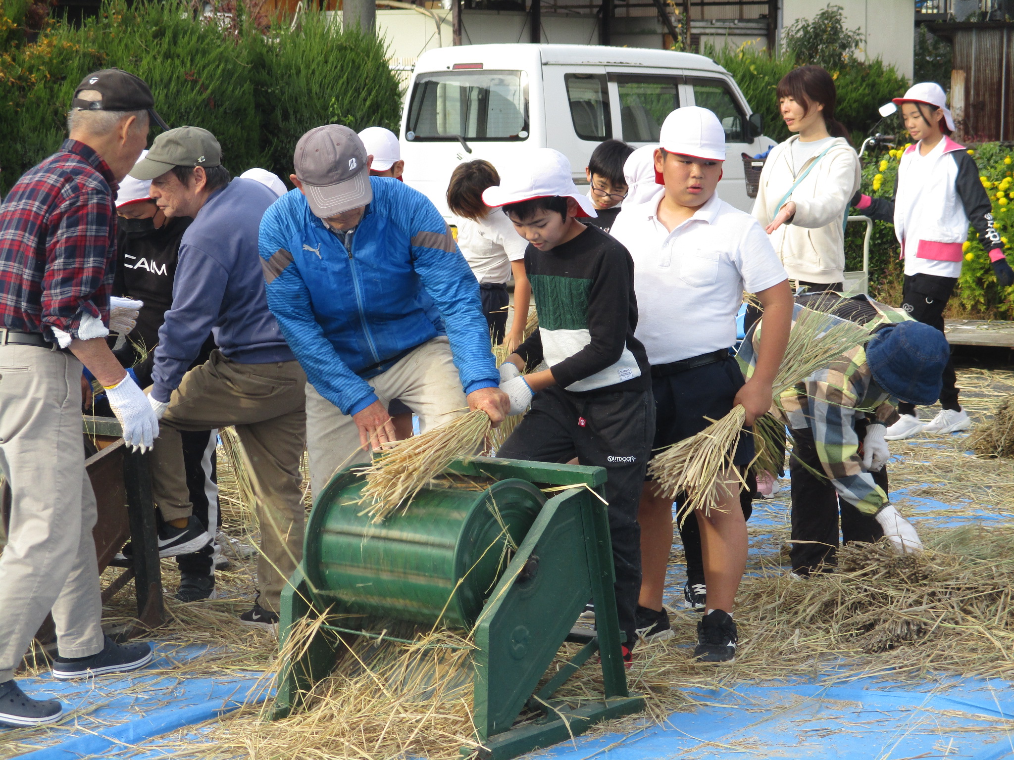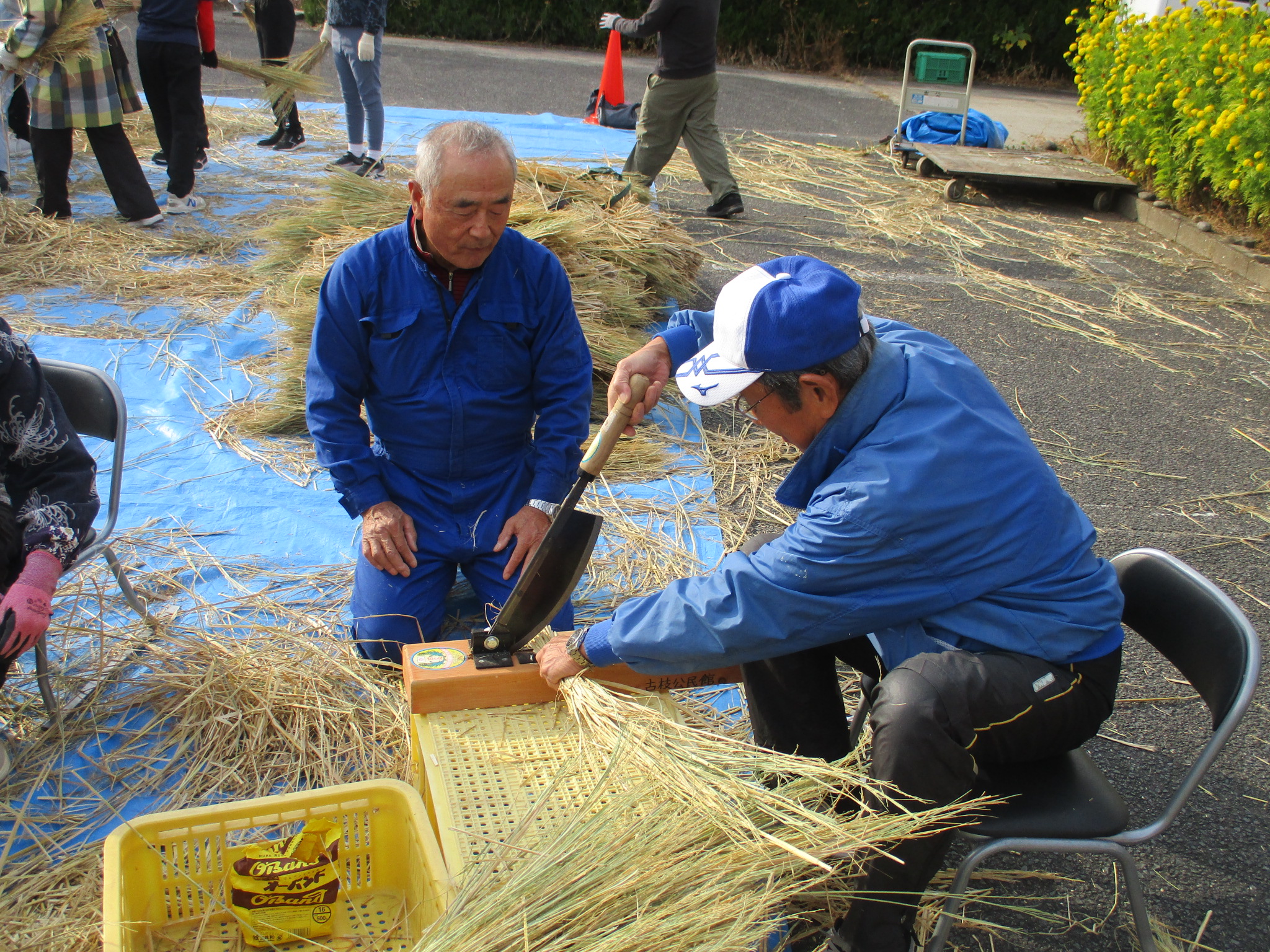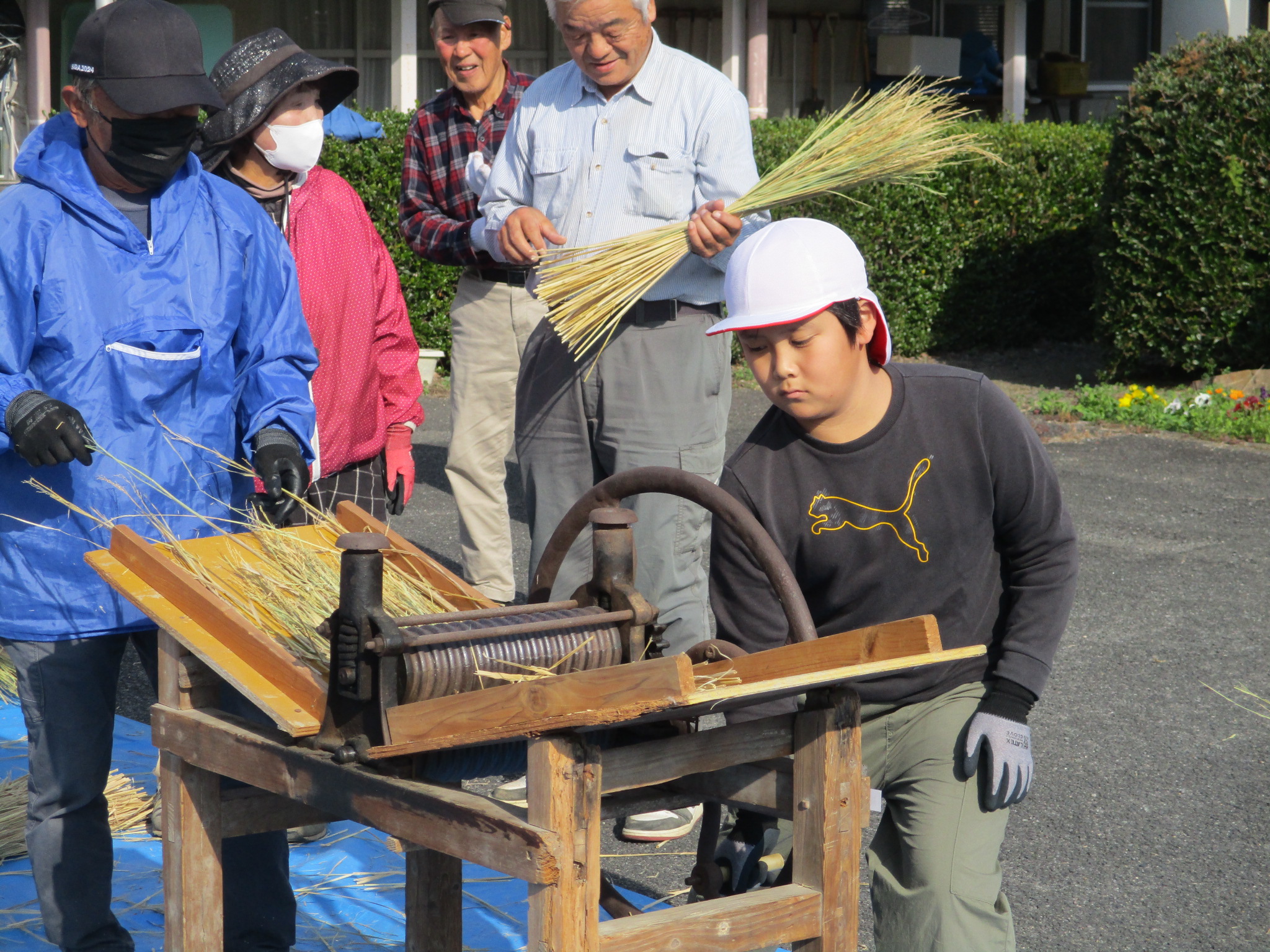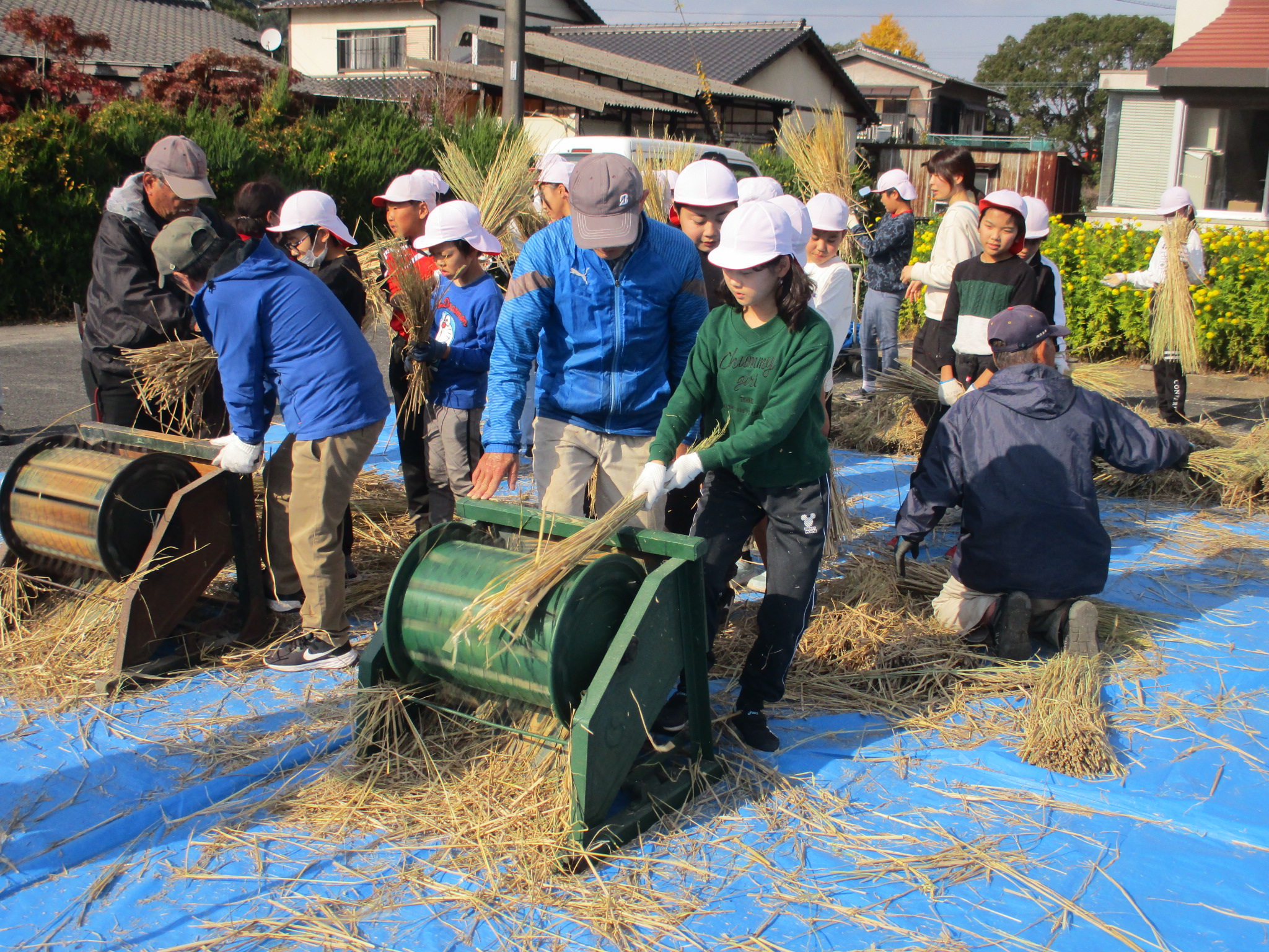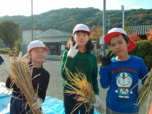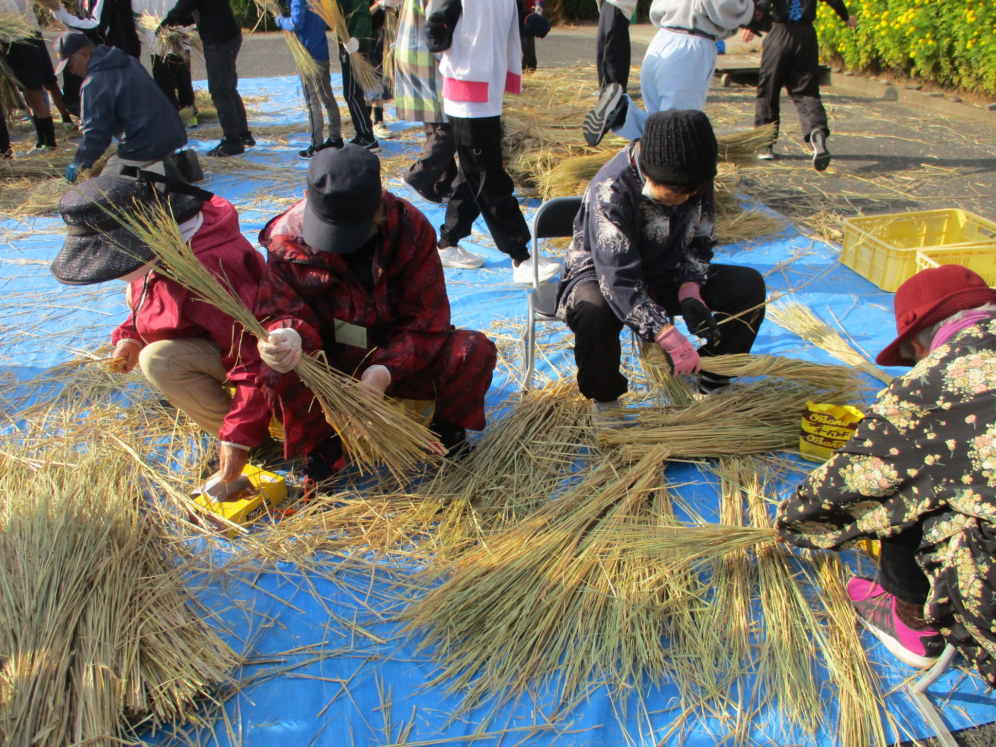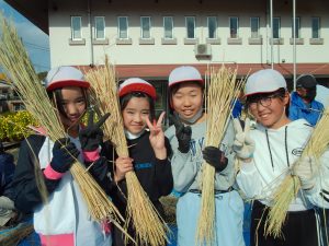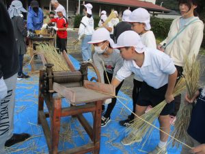 HOME > 学校紹介 > 日々の様子 > 5年生 わらうち体験 5年生 わらうち体験 入力日2025年12月16日 閲覧数10 5年生は、12月2日(火)に地域の方々といっしょに 「わらうち体験」を行いました。子どもたちは、普段目にすることのない道具に興味津々。使い方を丁寧に教えていただくと、次第にリズムよく藁を打てるようになっていきました。作業の中では、「昔の人は毎日こんなふうに作業していたんだ!すごい!」「大変〜。足と腰が痛い〜。」「力加減がむずかしい!」など、たくさんの声が聞こえてきました。 約2時間の活動で、なんと300束もの藁を作ることができました。みんなとてもよく頑張りました。 前へ 一覧へ戻る 次へ