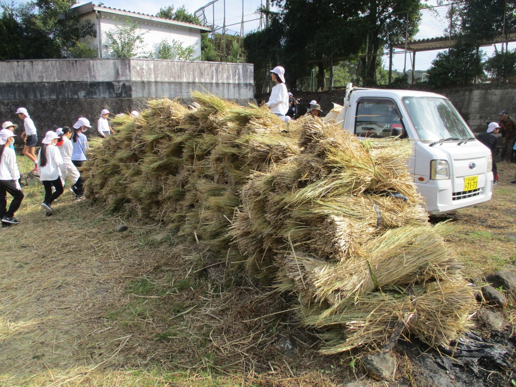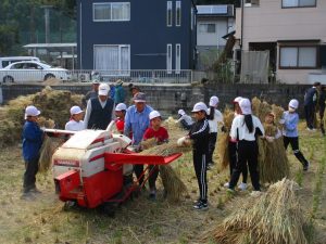 10月28日(火)に5年生が脱穀作業を行いました。今年は豊作だったこともあり、脱穀にも時間がかかりましたが、子どもたちは熱心に作業に取り組んでいました。