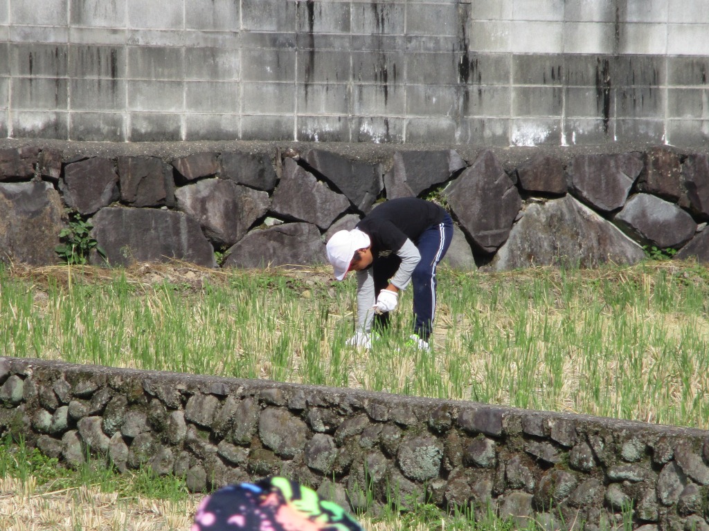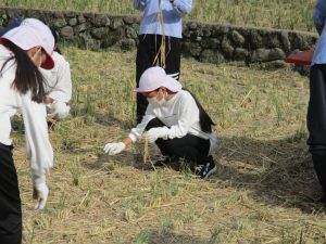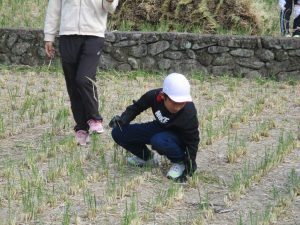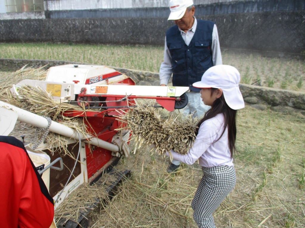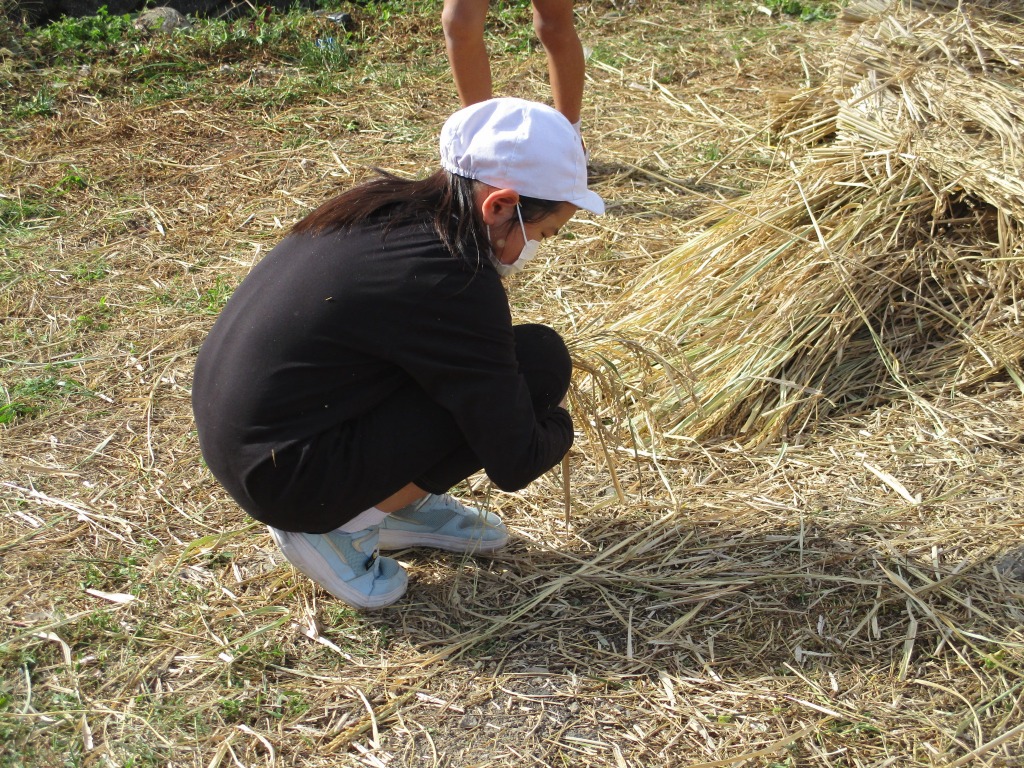 ある程度作業が終わりかけたころ、落ち穂を拾う子どもの姿が見られました。その姿を見て、他の子も田んぼを歩き回って落ち穂を拾い始めました。こういう体験を通して、お米の大切さを学んでくれたことと思います。
