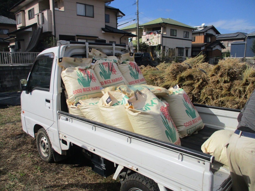 脱穀した籾はトラックいっぱいになり、藁も高く積みあがりました。