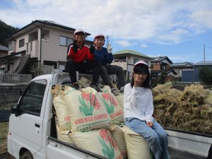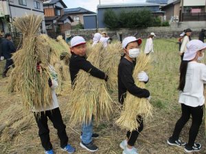 地域の皆様のおかげもあり、たくさんの米を収穫することができました。ありがとうございました。今後、このもち米は「150周年記念式典での祝い餅」「古枝地区ふれあい祭りの振舞い餅」「5年生の親子餅つき」で活用していきます。