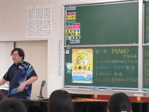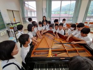 ピアノが大きな音を出せる秘密や、ピアノの構造などを分かりやすく教えていただき、5年生の子ども達も目を輝かせながら話を聞いていました。