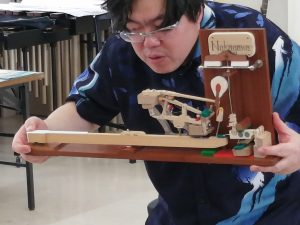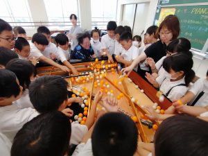 ピアノの響板の効果を確かめるために、大量のピンポン玉を置いて演奏するという実験も見せてもらいました。ピンポン玉が大きく跳ねあがったり、ピアノから飛び出したりする様子を見て、子どもたちは驚くとともに、ピアノの音が大きく出る理由に納得した表情を見せていました。