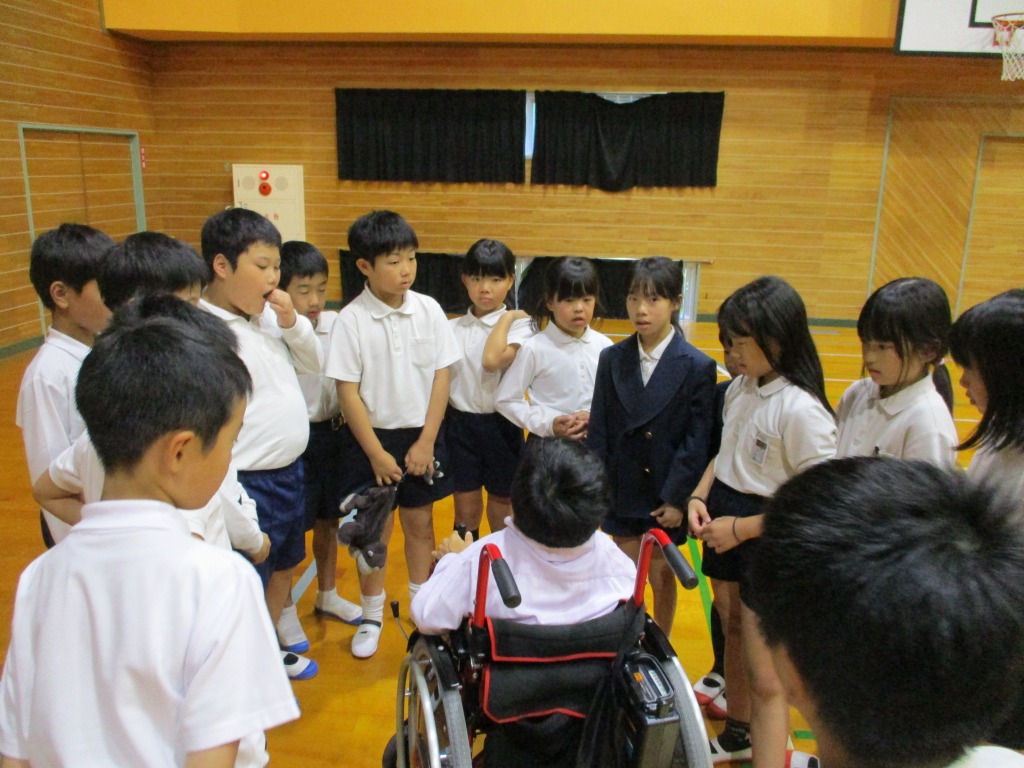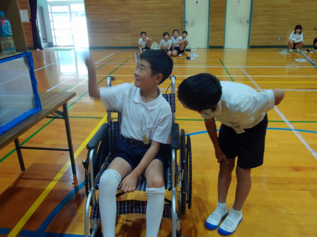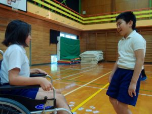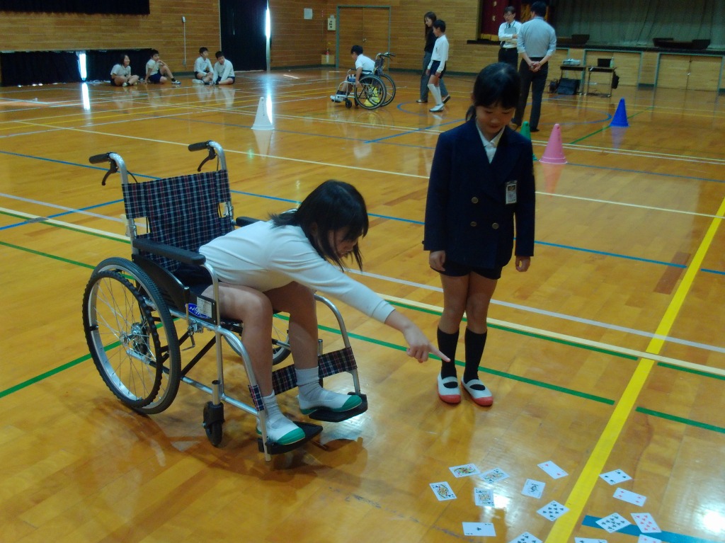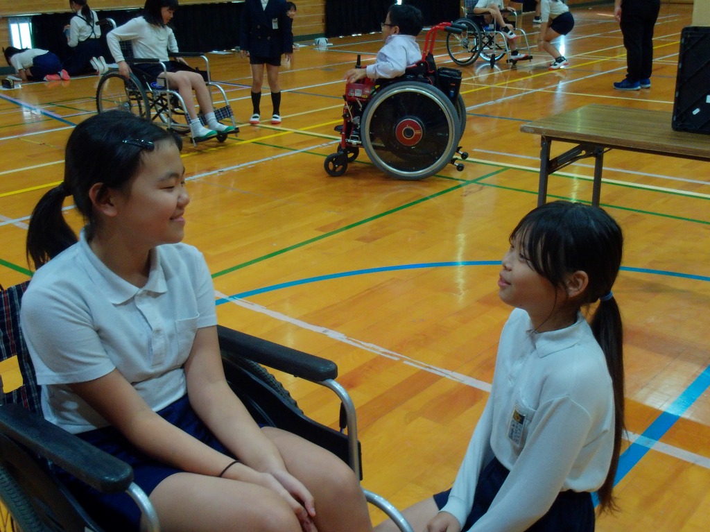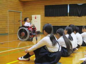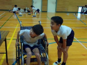 お話の後には、車椅子の体験をしました。ペアになって活動し、相手に優しく声をかけながら体験する姿が見られました。