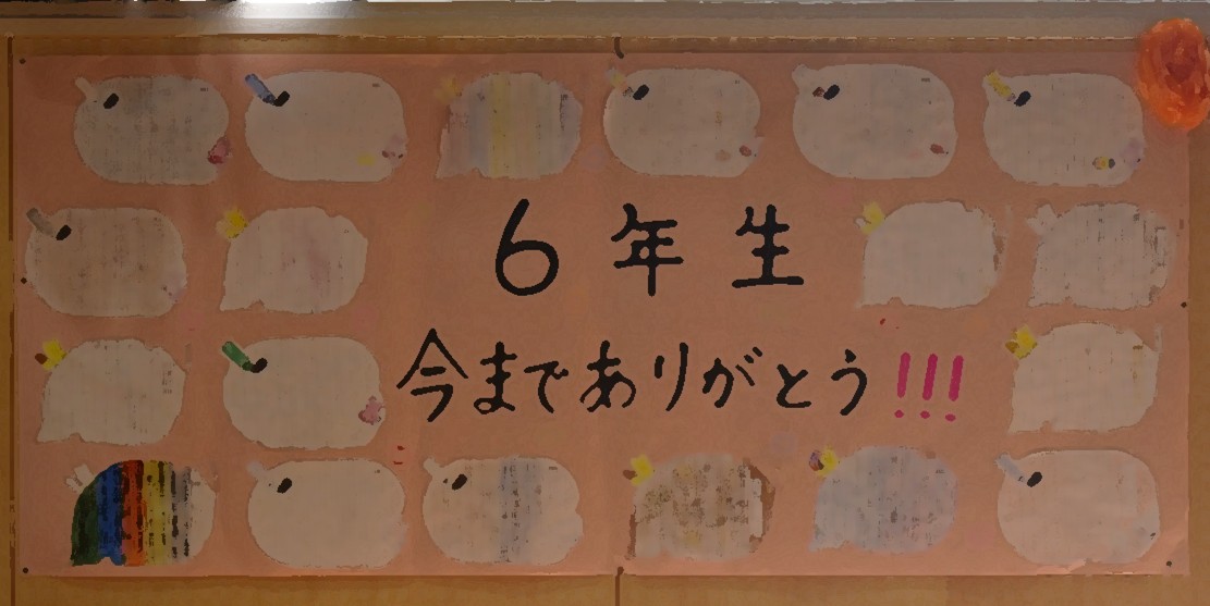 2月26日に「6年生をおくる会」「鍵送りの式」をしました。6年生は、1年生からひとりずつ金メダルをかけてもらい、手をつないで体育館に入場しました。それぞれの学年から、6年生への感謝の気持ちや6年生のがんばりを紹介する内容の発表が続き、最後は6年生からお礼の歌と言葉がありました。最後は、くす玉や人間アーチでの退場など、代表委員会で話し合われた「盛り上げるための工夫」があり、6年生は笑顔いっぱいでした。