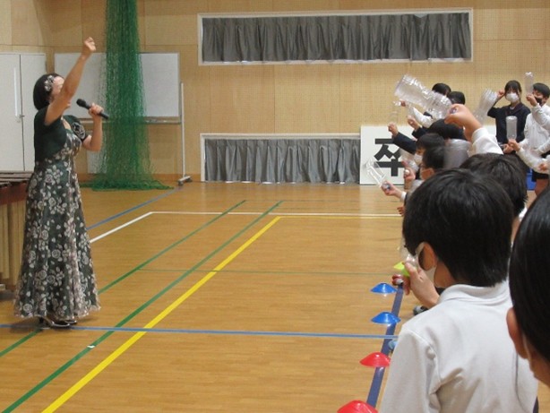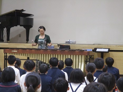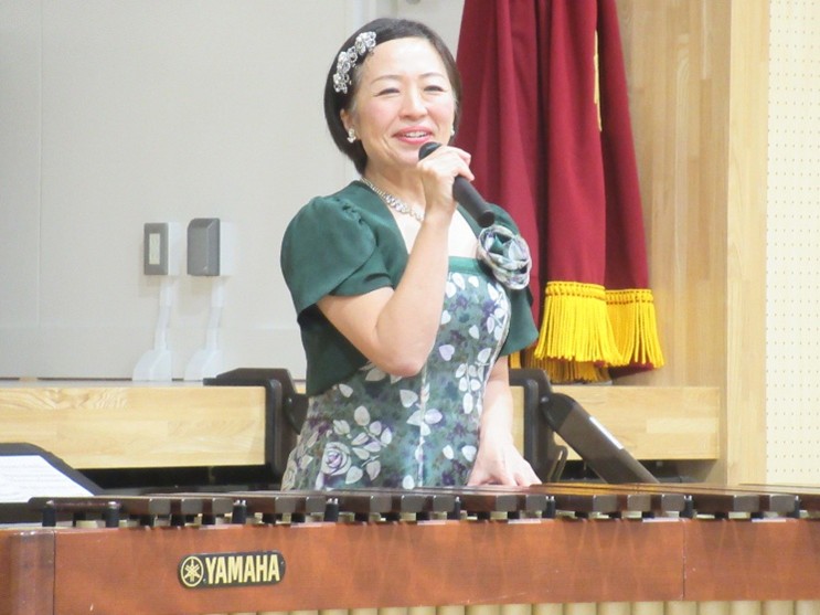 12月2日(火)に浜小学校創立150周年記念事業のひとつとして、朝倉香絵(あさくらかえ)さんによる「マリンバコンサート」を開催しました。プロのマリンバ奏者である朝倉さんは、東京を拠点として活動されていましたが、2021年から全国各地を旅しながら芸術文化の振興を目的として様々な活動をされています。その中で、浜の庄金地区に2022年3月から、旧橋本家住宅に「スタジオ有明の月」と名付けて移住され、庄金地区の行事での演奏や、東部中学校の吹奏楽部の指導もされています。クリスマスソングや浜小の校歌、クラシックからアニメソング、Jポップまで、様々なジャンルの曲を演奏されました。子どもたちは、ペットボトルで作ったシェーカーを1こずつ持ち、マリンバとのセッションを楽しみました。