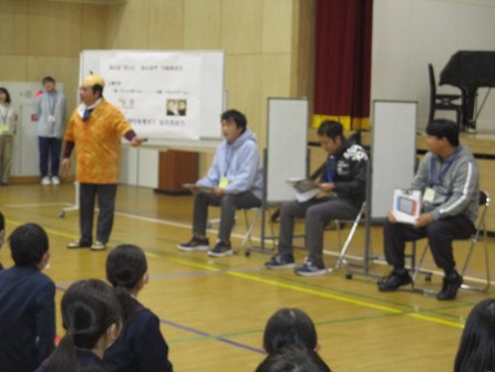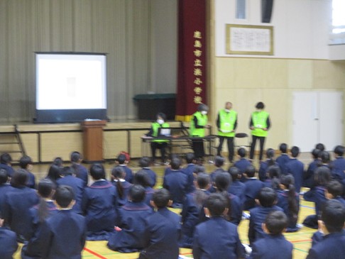 12月5日(金)は人権集会で鹿島市人権擁護委員の皆様のお話や各学年から人権標語の発表、学校職員と「よしろうおんちゃん」として登場されたRACCOさん(いなばゆうこさん)による人権劇がありました。人権擁護委員の方からは、車いす利用の方のためにエレべーターの室内に鏡がある理由などのお話がありました。人権標語は、それぞれの学年で言葉を選び、工夫して短文にしたものを発表しました。浜小恒例の?人権劇では、ドッジボール編とネットゲーム編の場面があり、相手が受け取る言葉の重さや、どのような言葉を使えば傷つけないかについて考えました。