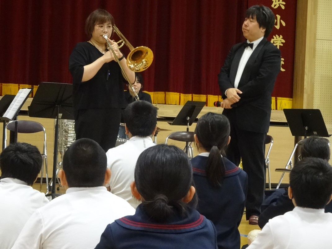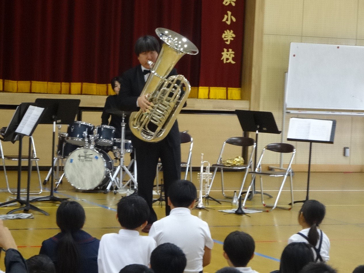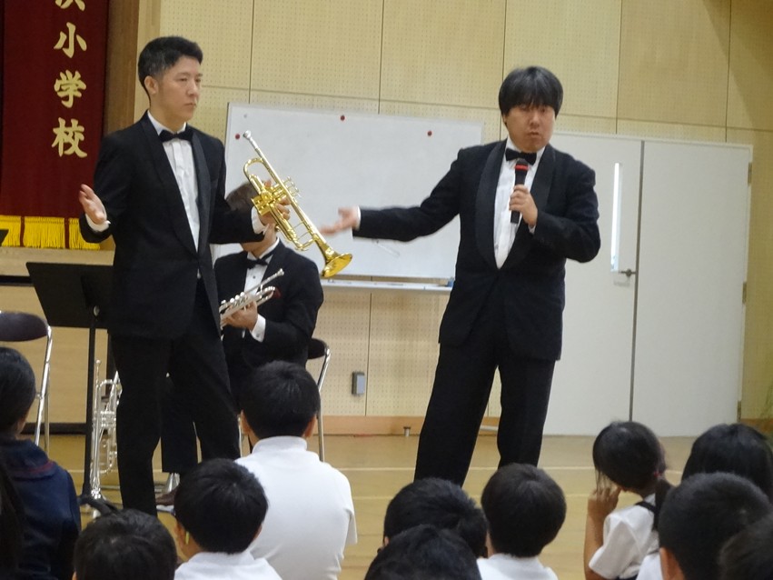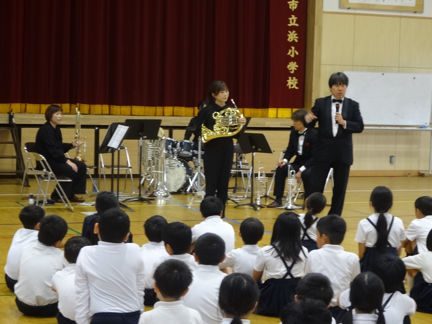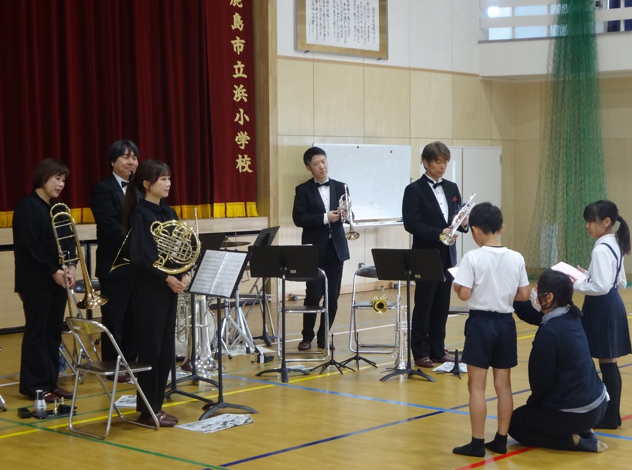 文化庁の事業である「令和7年度学校における文化芸術鑑賞・体験推進事業芸術家の派遣」として、大阪から「オルカミュージック」様が来られました。10月27日・28日・29日の3回にわたって、それぞれ、中学年・高学年・低学年の児童が、生演奏を堪能しました。トランペットやホルン等の金管楽器5名とドラム1名の計6名の編成でした。「トランペット吹きの休日」などの有名なクラシックに加えて、アニメやポップスなど、子どもたちがしっている曲もたくさん演奏されました。浜小学校の校歌も演奏され、みんなで元気よく歌いました。質問コーナーでは、楽器の値段に驚いたり、練習時間に感心したりして、楽しい時間はあっという間に過ぎたように感じました。アンコールで「はいよろこんで」が演奏されると、歌ったり、ダンスをしたり、みんなリズムにのって楽しみました。それぞれの代表児童の「お礼のことば」も上手に伝えることができました。「心の栄養」をたっぷりいただく時間となりました。