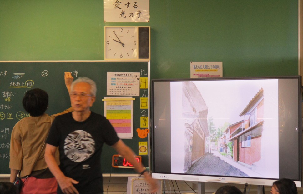HOME > 学校生活 > ある日の風景 > 4年生へ熊本先生によるスケッチ指導 4年生へ熊本先生によるスケッチ指導 入力日2025年9月19日 閲覧数33 9月19日に4年生が特別非常勤講師の熊本義泰先生からスケッチについてのお話を聞きました。陶芸家であり画家でもある熊本先生ご自身が描かれた多くの水彩画について、それぞれの色使いや構図、場所選びなどについて丁寧に話してくださいました。提示される作品は、どれも浜地区の風景で見たことのあるところばかりでした。子どもたちは、見慣れた景色が、水彩画によって鮮やかな作品となっていることに大変興味をもったようでした。来週は実際に校外へ出てスケッチをはじめます。 前へ 一覧へ戻る 次へ