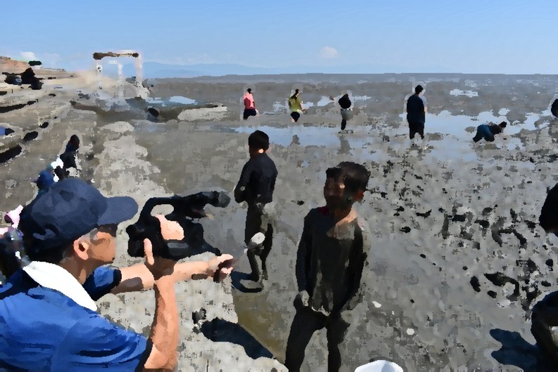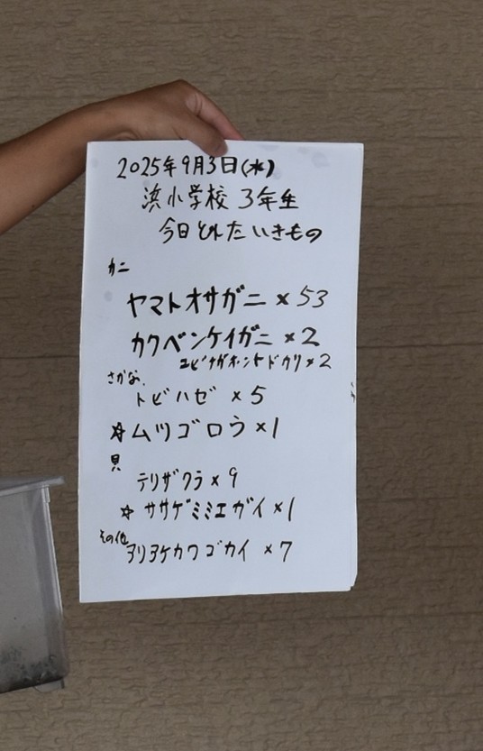 9月3日に七浦海浜公園で3年生が総合的な学習として干潟体験をしました。鹿島市のラムサール条約推進室の方の指導で干潟に生息する生き物について学び、実際に干潟に入って、いろいろな生き物を見つけました。子どもたちがシャワーを浴びて着替えている間に、ラムサール条約推進室の方が生き物を種類ごとに分けて水槽にいれ、数を数えてくださいました。一番多かったのは、ヤマトオサガニでした。この日は、むつかけ漁をされている方の様子を見たり、NHKの取材もあったり、貴重な体験となりました。宝の海である有明海での思い出ができました。