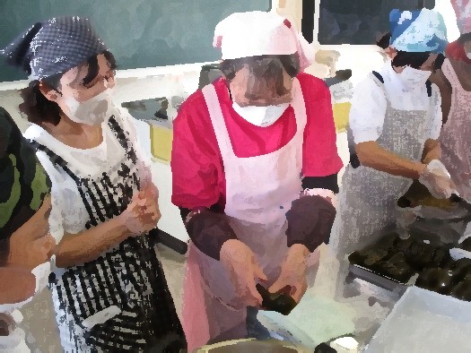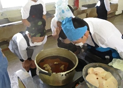 11月11日に5年生が総合の学習で、鹿島市食生活改善推進協議会(食改協)の皆様の指導でふなんこぐいの調理をしました。浜地区の伝統料理であるふなんこぐい、学習では、ふなの代わりにさばを使って作りました。大きな大根を包丁で切ったり、さばを昆布で巻いたりして、大きな鍋に仕込みました。完成するまでの煮込みは、鍋を自宅までお持ち帰りいただき、翌12日に学校まで持ってきてくださいました。5年生や学校職員で給食時間においしくいただきました。鹿島市食生活改善推進協議会の皆様は、農林水産省の第7回食育活動表彰で消費・安全局長賞を受賞されるなど、浜小学校でも長年お世話になっています。地域の郷土料理のご指導をありがとうございました。
