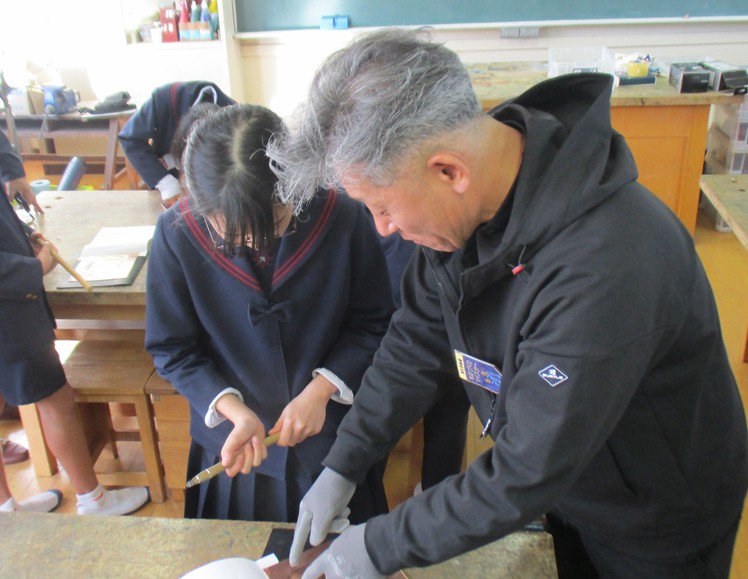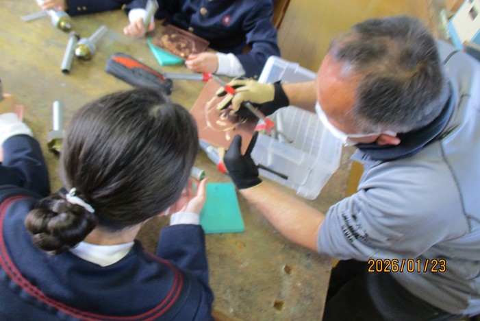HOME > 学校生活 > ある日の風景 > 6年生卒業制作 6年生卒業制作 入力日2026年1月26日 閲覧数36 1月23日に6年生が、卒業記念制作として、銅版レリーフによる自画像制作をしました。この銅版レリーフに取り組んでいるのは、佐賀県では浜小だけだそうです。佐賀県技能センター主催の「もの作り体験教室」に申し込み、浜小では、毎年6年生が取り組んでいます。「もの作りマイスター」に認定されている鹿島市の井田板金の井田正則様と大町町の松尾板金様の指導で、1日かけて完成させました。下書きから、多くの工程を経て完成した作品。世界に一つだけの卒業記念制作になりました。 前へ 一覧へ戻る 次へ
