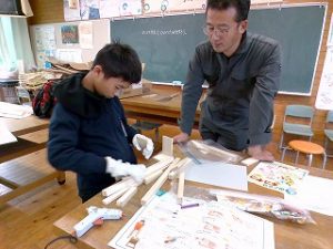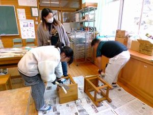 4年生 図工「のこぎりぎこぎこ」おうちの人と一緒に木材を切ったりくっつけたりしました。