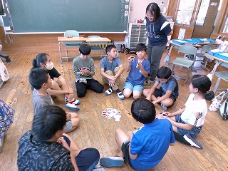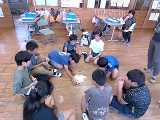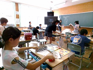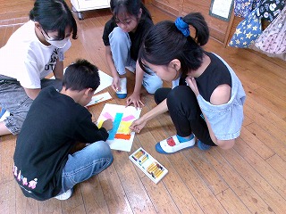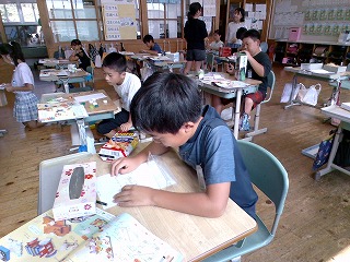 1年生、6年生 一緒に150周年記念集会の看板づくり。運動会のスローガンづくりの時と同じ要領で。慣れたものです。