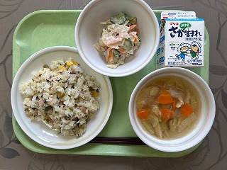 今日の給食は、日本味めぐり「熊本県」でした。高菜飯、レンコンのからしあえ、中華スープでした。