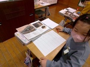 1年生 国語「子どもをまもるどうぶつたち」学習したことを使って、教科書以外の動物がどうやって子どもを守っているのか、調べてまとめています。