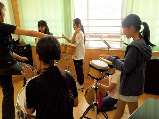 5年生 音楽 先生の腕の動きや体の動かし方を見ながら、リズムや強弱を考えて表現しました。よく見て表現でき