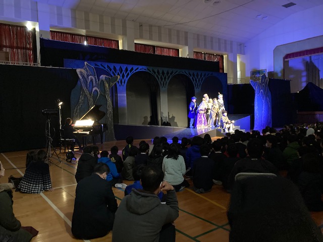 HOME > Blog > 学校の様子 > 12.8(木) 芸術鑑賞 12.8(木) 芸術鑑賞 入力日2022年12月8日 閲覧数341 オペラシアターこんにゃく座による「森は生きている」という90分のミュージカルのような演劇が、本校体育館で行われました。さすがプロの皆さん!歌やセリフ、そして演技力とどれをとっても素晴らしい表現力で、まさにあっと言う間に時間が過ぎたようなひとときでした。子どもたちも目の前でそれを見て、その芸術性の高さは十分伝わったものと思います。その一部を写真で紹介します。 前へ 一覧へ戻る 次へ