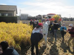 HOME > イベントギャラリー > 5年生のもち米の収穫(10/29) 5年生のもち米の収穫(10/29) 入力日2021年11月14日 閲覧数35,607 10月29日(金)、5年生の子供たちが、学校運営協議会委員や地域の皆様の協力のもと、7月に田植えをしたもち米の収穫を行いました。秋晴れのもと、自分達で刈った稲穂をコンバインまで運び、脱穀をしてもらいました。また、昨年度同様、足踏み脱穀機での脱穀も体験しました。 脱穀したもち米は、約1週間の天日干しを行いました。 今年も豊作で、30kg袋で約8袋(237kg)の収穫がありました。これまでたくさんの方々にご協力いただいたことに感謝申し上げます。 前へ 一覧へ戻る 次へ
