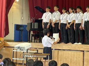 朝の時間に教育実習生赴任式と2学期の始業式が行われました。