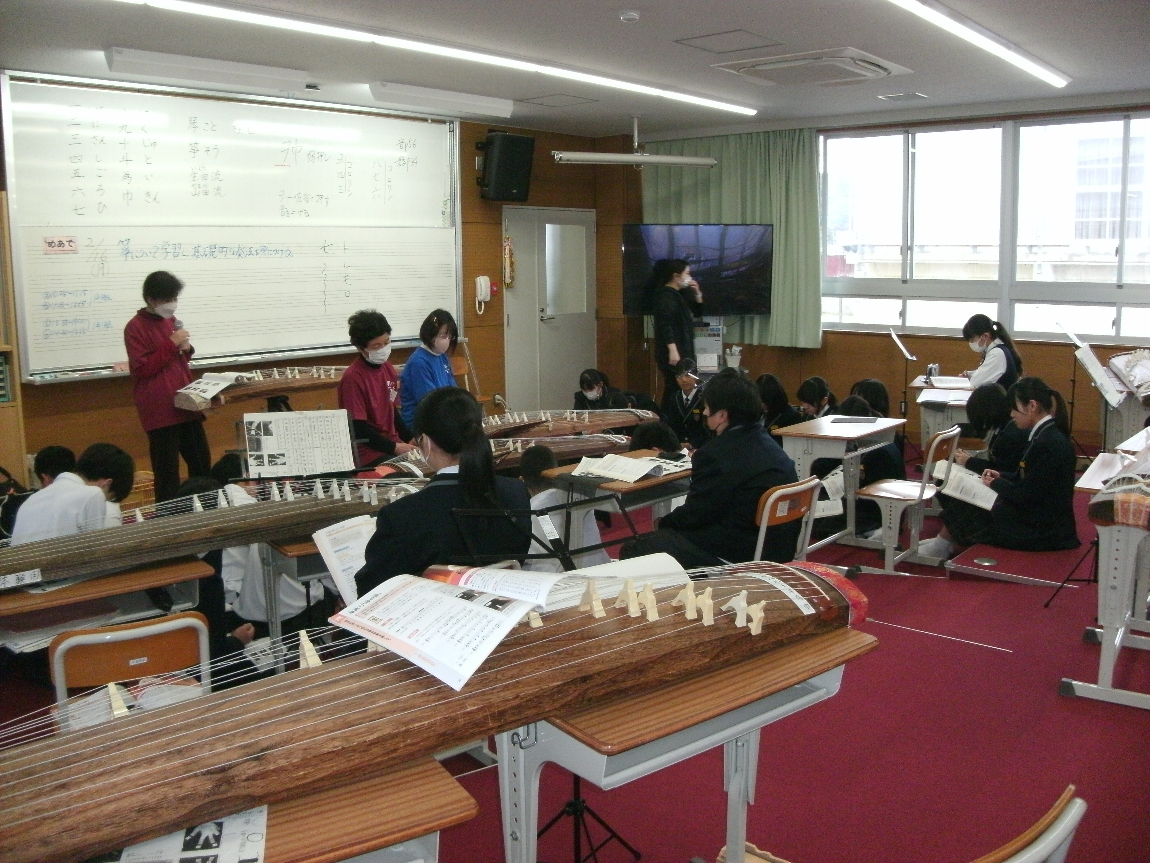 HOME > 教育活動 > 学校のようす > 箏の授業 1年生 箏の授業 1年生 入力日2026年2月18日 内容 今週は1年生の音楽で箏の授業がありました。日本の伝統音楽を守る会の方々が講師として熱心に指導してくださいました。 箏の文化や仕組み、指の使い方などを教わり、実際に触れて音を奏でか、簡単な演奏にチャレンジしました。日本の伝統文化に触れる貴重な体験をすることができました。 閲覧数60 前へ 次へ