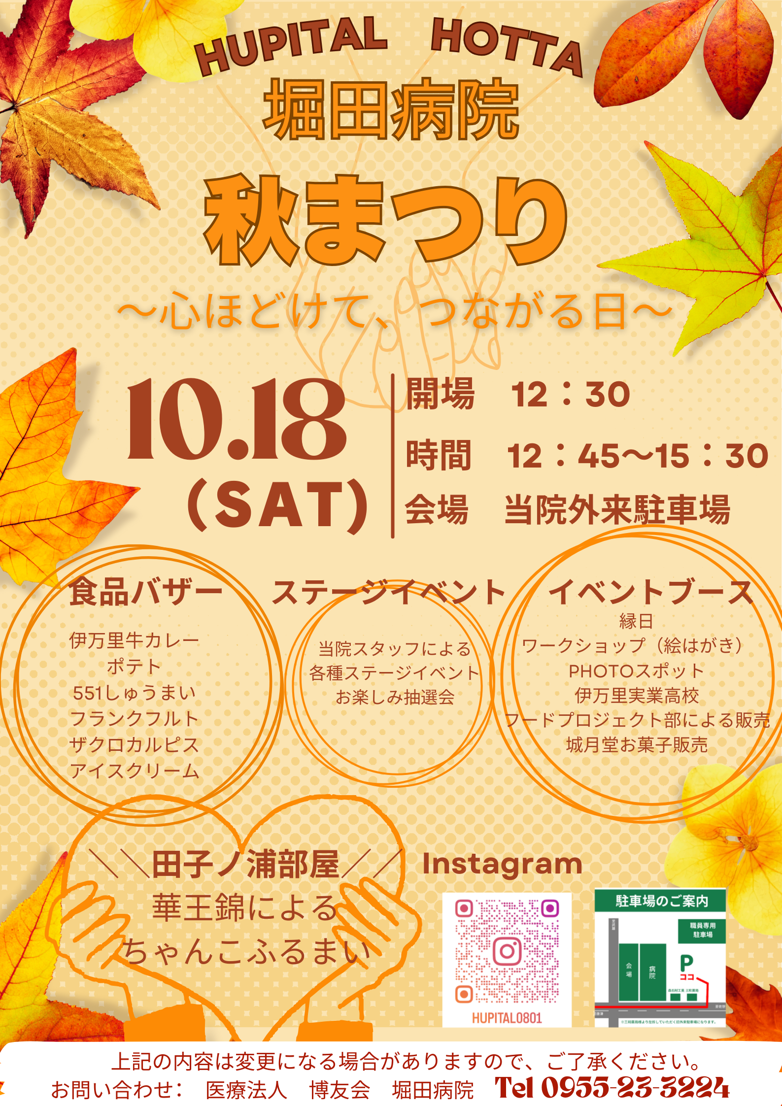 HOME > フードプロジェクト部コーナー > フードプロジェクト部が秋まつりに出店します! フードプロジェクト部が秋まつりに出店します! 入力日2025年10月14日 内容フードプロジェクト部が秋まつりに出店します! 〇日 時:令和7年10月18日(土) 12:45~15:30 〇場 所:堀田病院(伊万里市立花町)外来駐車場 詳しくは添付ファイルよりチラシをご覧ください! 閲覧数2 前へ 次へ