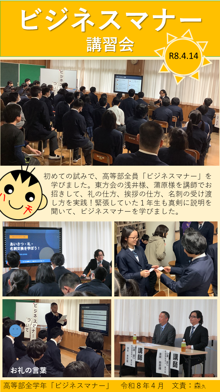 HOME > 高等部 > 高等部トピックス 高等部トピックス 高等部トピックス すべて タイトル 内容 ビジネスマナー講習会 高等部 歓迎会 高等部1年生 2年生に向けて 卒業生を送る会 AIを使った絵本作り はってんマーケットinくすきの杜 作業製品について はってんマーケット㏌くすきの杜について 書初め大会 星の王子さま 高等部2年生 地域清掃ボランティアと向陽園訪問 123...次へ