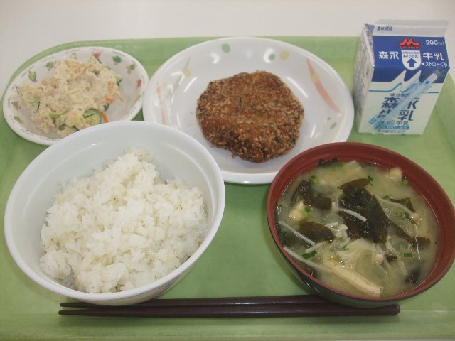 麦ごはん、牛乳、手作りギョロッケ、おからサラダ、みそ汁 799kcal