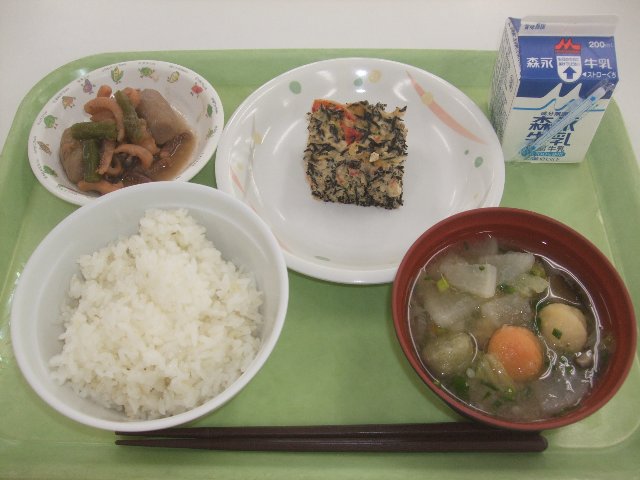 麦ごはん、牛乳、五目たまご焼き、🐟唐津産スルメイカと里芋の煮物、みぞれ汁 696kcal