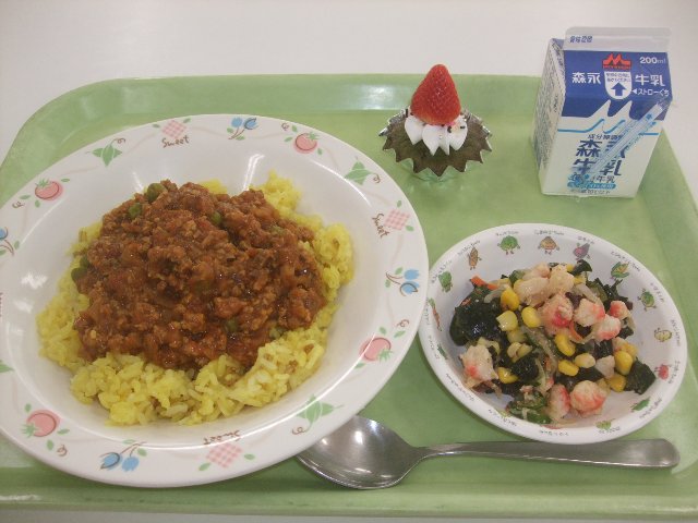 ドライカレー(伊万里産もち麦入りターメリックライス)、牛乳、海藻サラダ、手作りミニカップケーキ🎄 807kcal