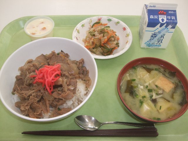 伊万里牛丼、牛乳、梅おかか和え、みそ汁、さがみかん入りミルクゼリー 870kcal