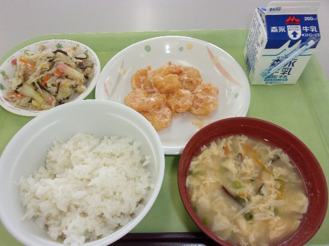 麦ごはん、牛乳、えびマヨネーズ、炒めビーフン、五目スープ 792kcal
