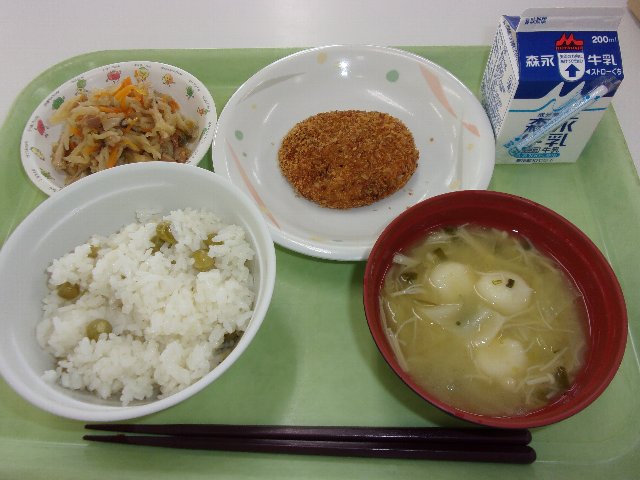 ピースごはん、牛乳、コロッケ、切り干し大根の炒り煮、みそ汁 794kcal