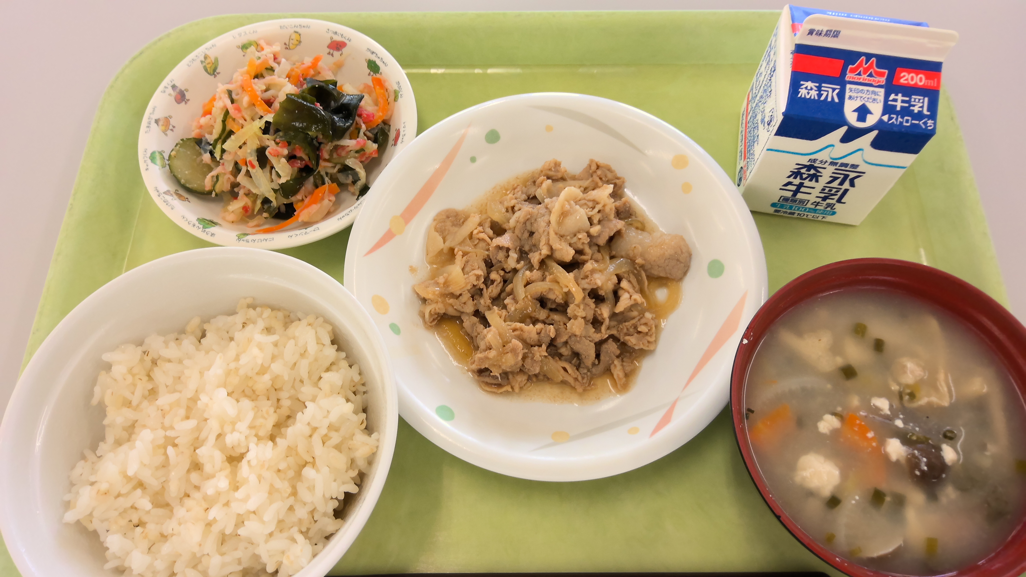 献立名:麦ごはん、牛乳、豚肉のしょうが炒め、酢みそあえ、けんちん汁