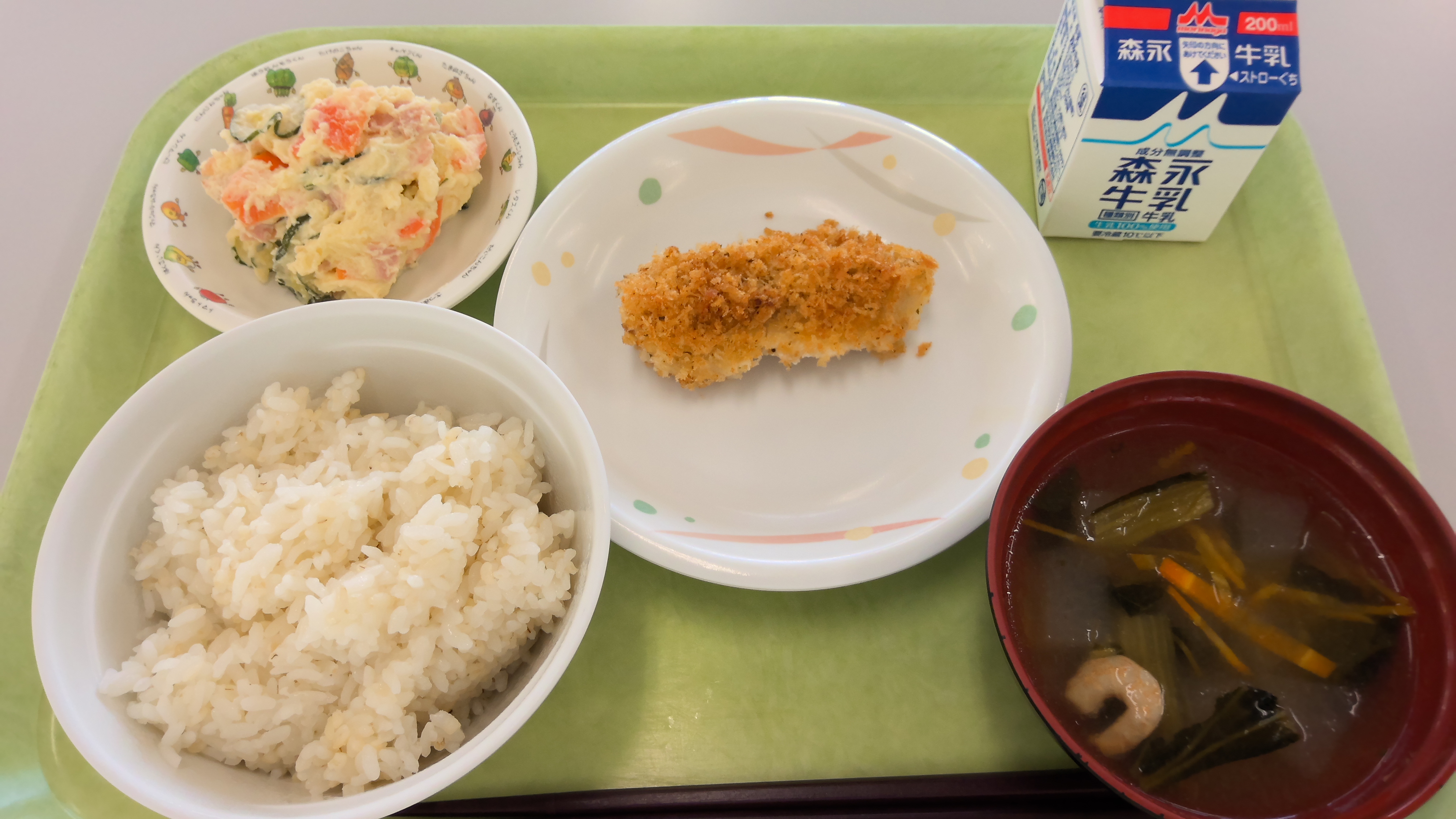 献立名:麦ごはん、牛乳、魚の香草パン粉焼き、ポテトサラダ、えびと冬瓜のスープ