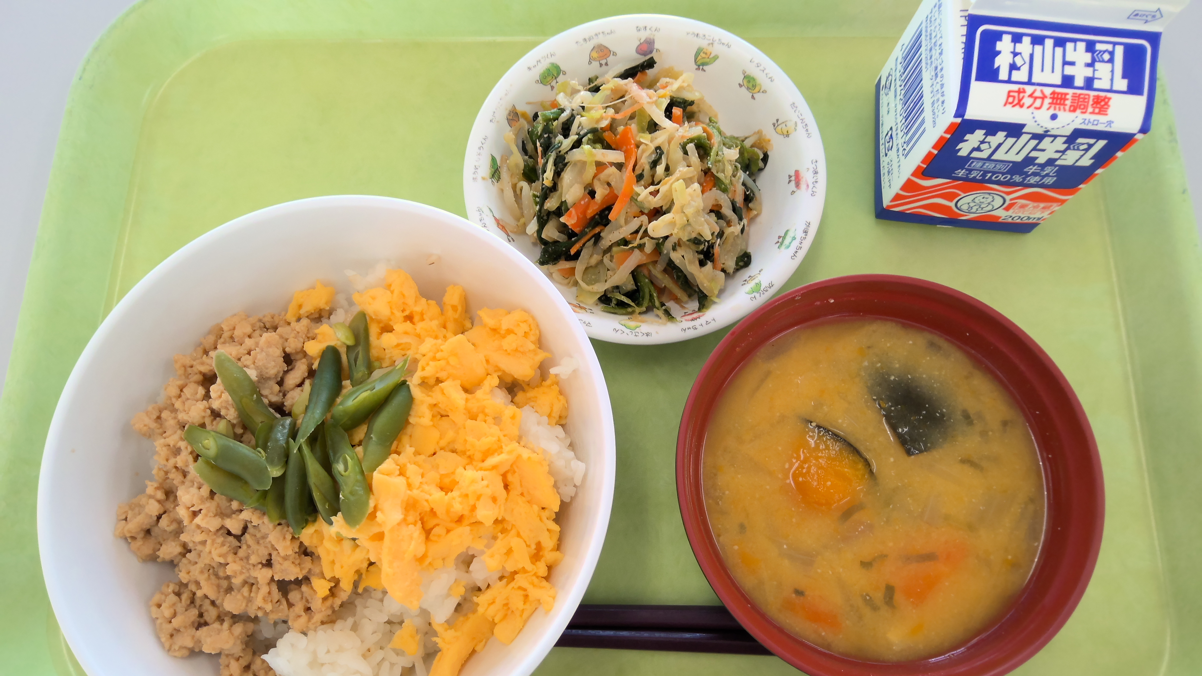 献立名:そぼろ丼、牛乳、ごまあえ、かぼちゃのみそ汁