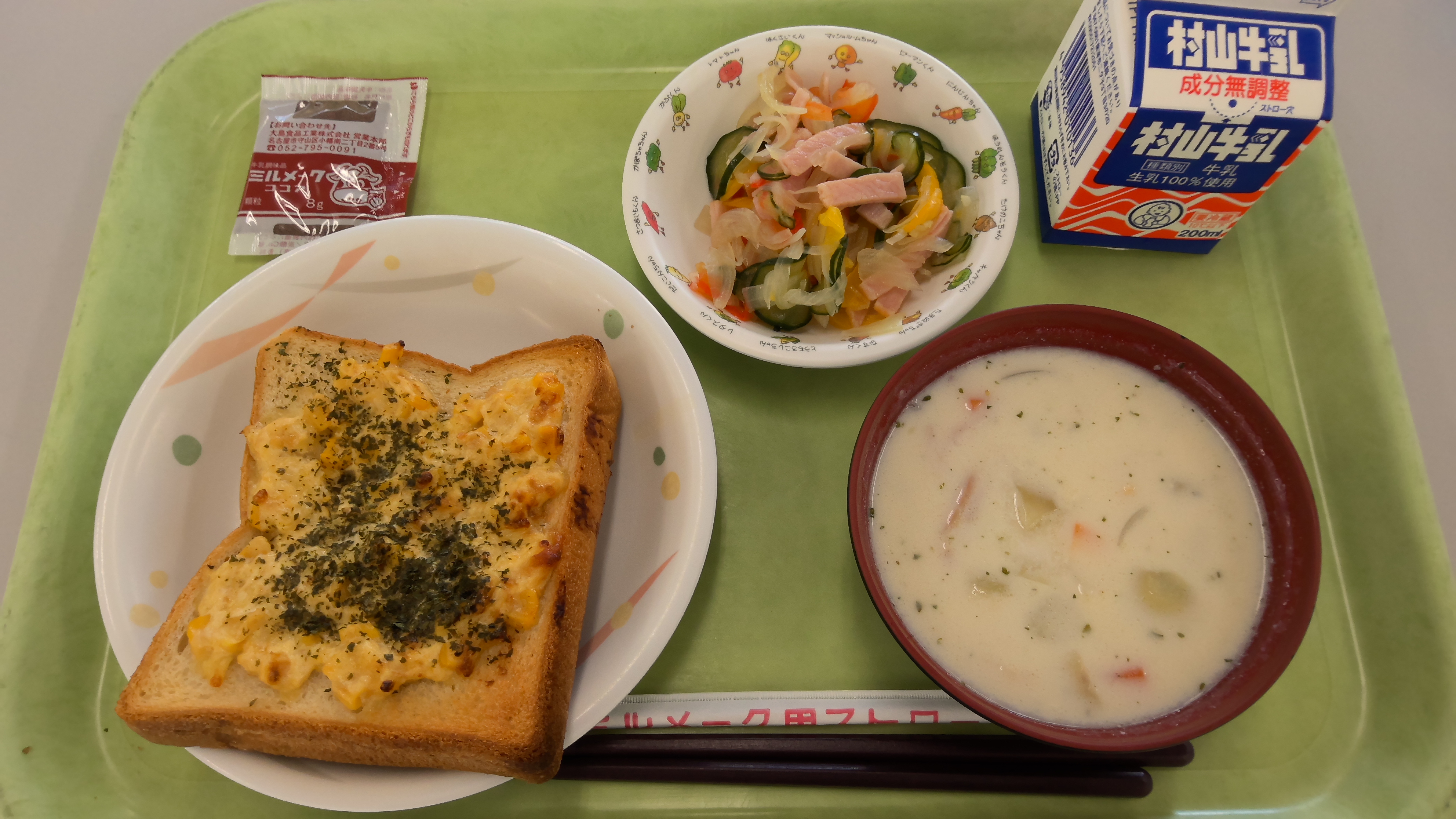 献立名:コーンマヨトースト、牛乳&ミルメーク(ココア)、ハムのマリネ、クラムチャウダー