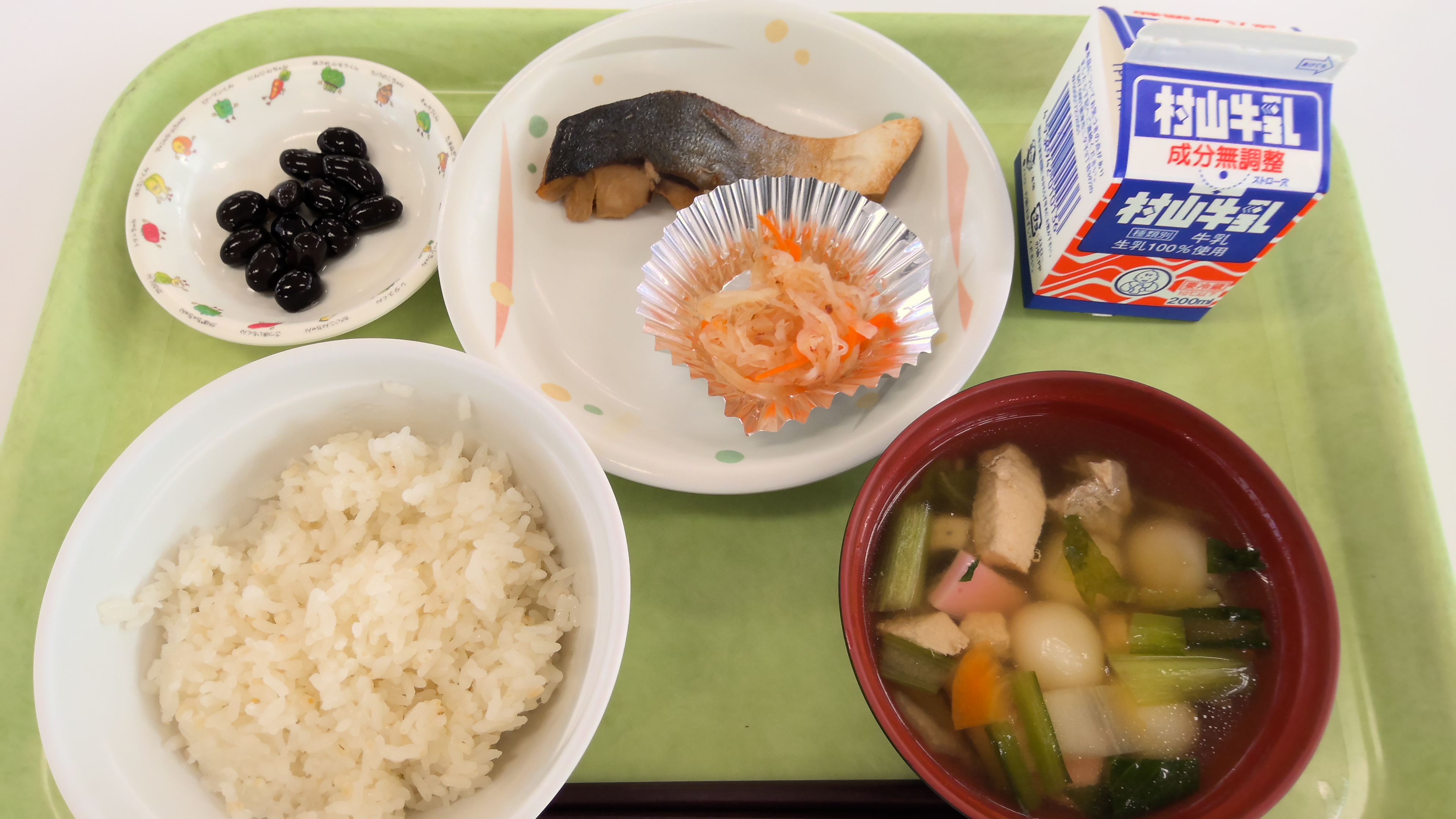 献立名:麦ごはん、牛乳、ぶりの照り焼き、紅白なます、雑煮、黒豆