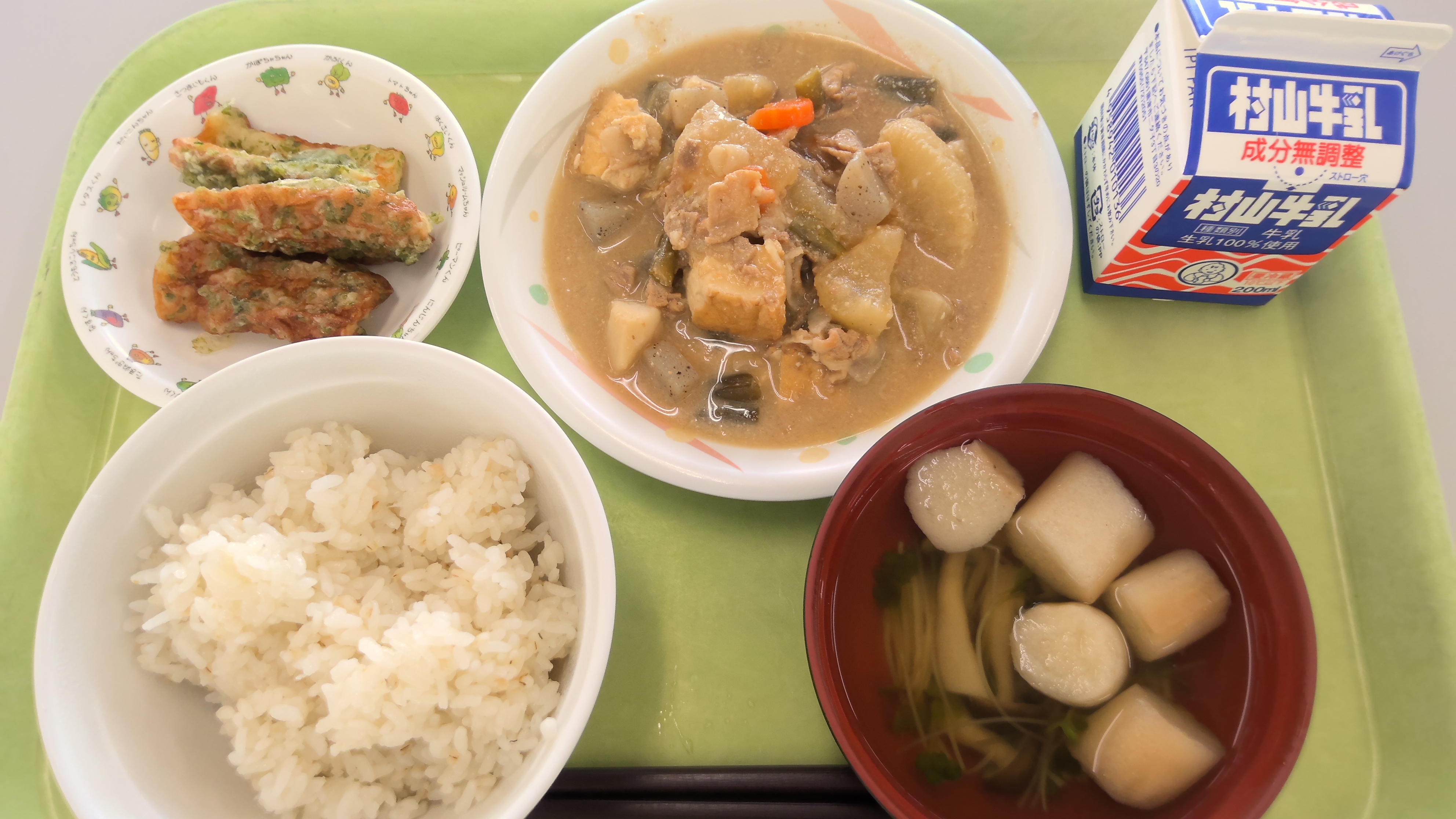 献立名:麦ごはん、牛乳、みそ煮、ちくわの磯辺揚げ、きのこと麩のすまし汁