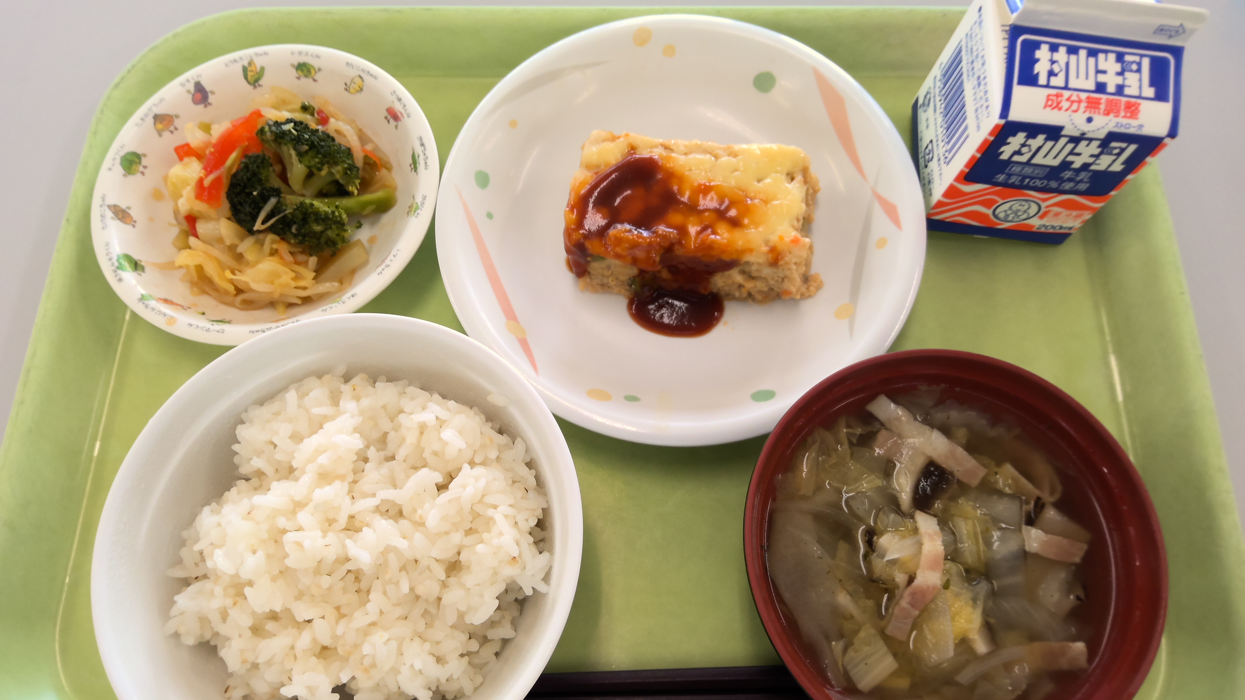 献立名:麦ごはん、牛乳、ミートローフ、ブロッコリーのサラダ、白菜のスープ