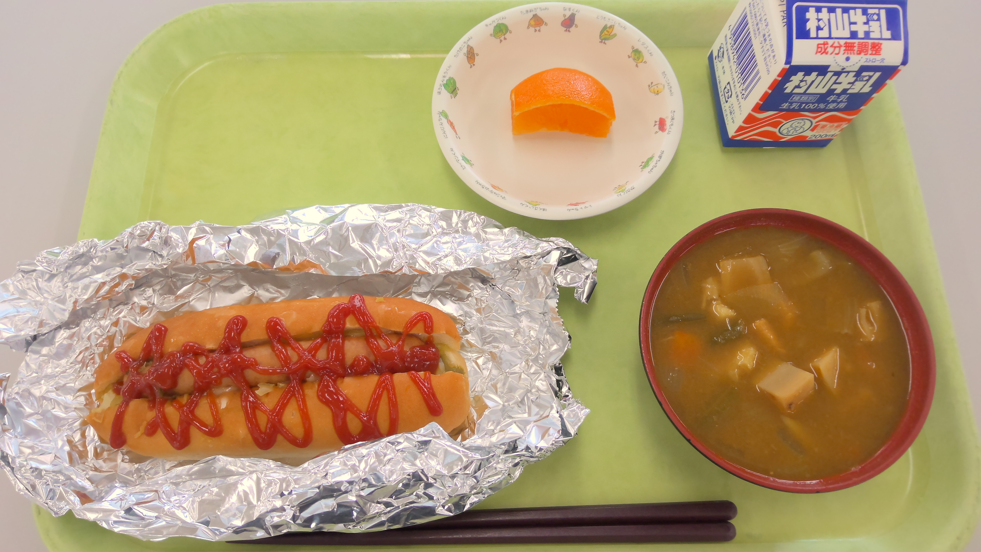 献立名:ホットドッグ、牛乳、根菜のカレースープ、くだもの(ポンカン)