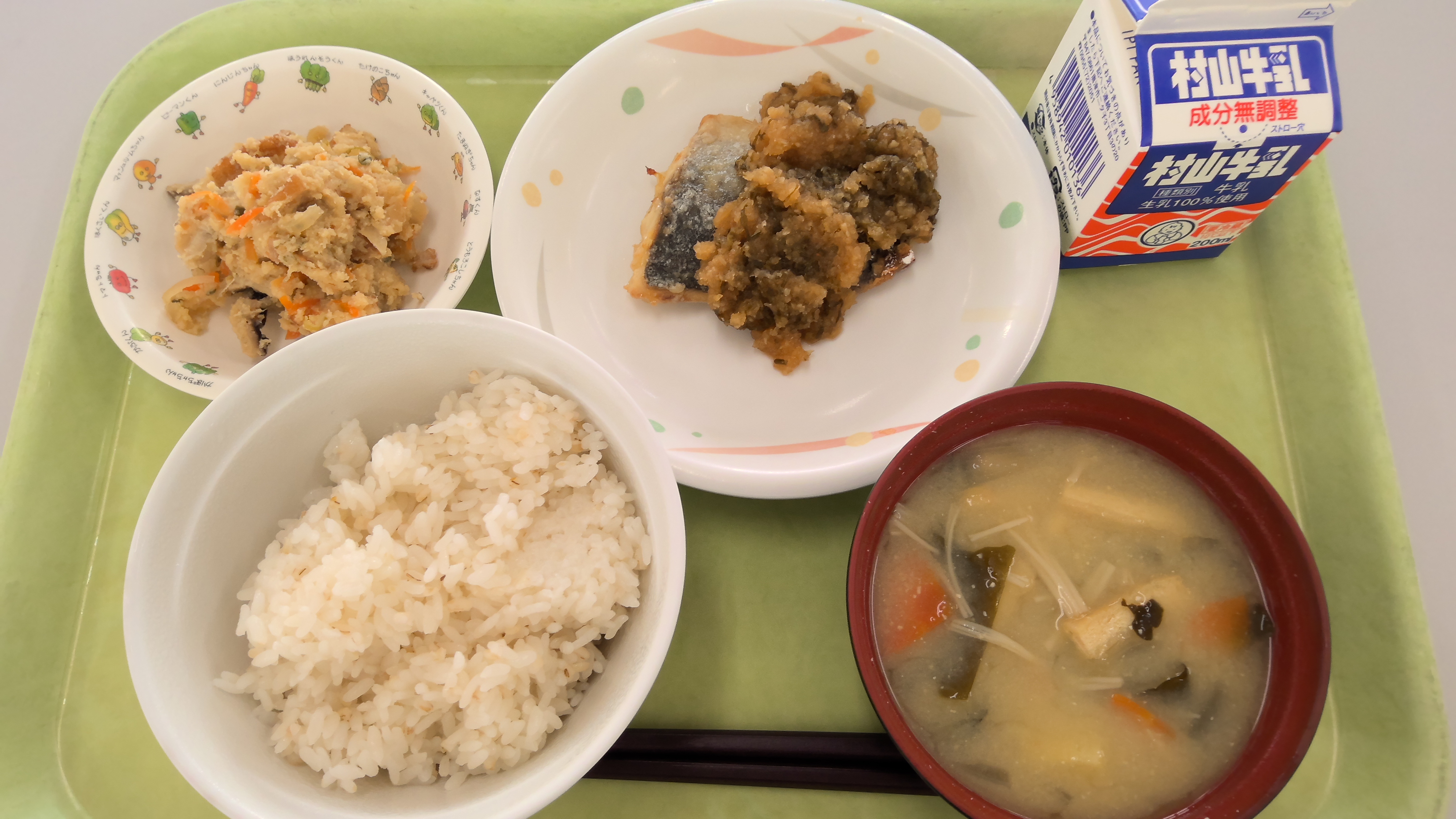 献立名:麦ごはん、牛乳、あじのおろしポン酢かけ、おからの炒り煮、みそ汁