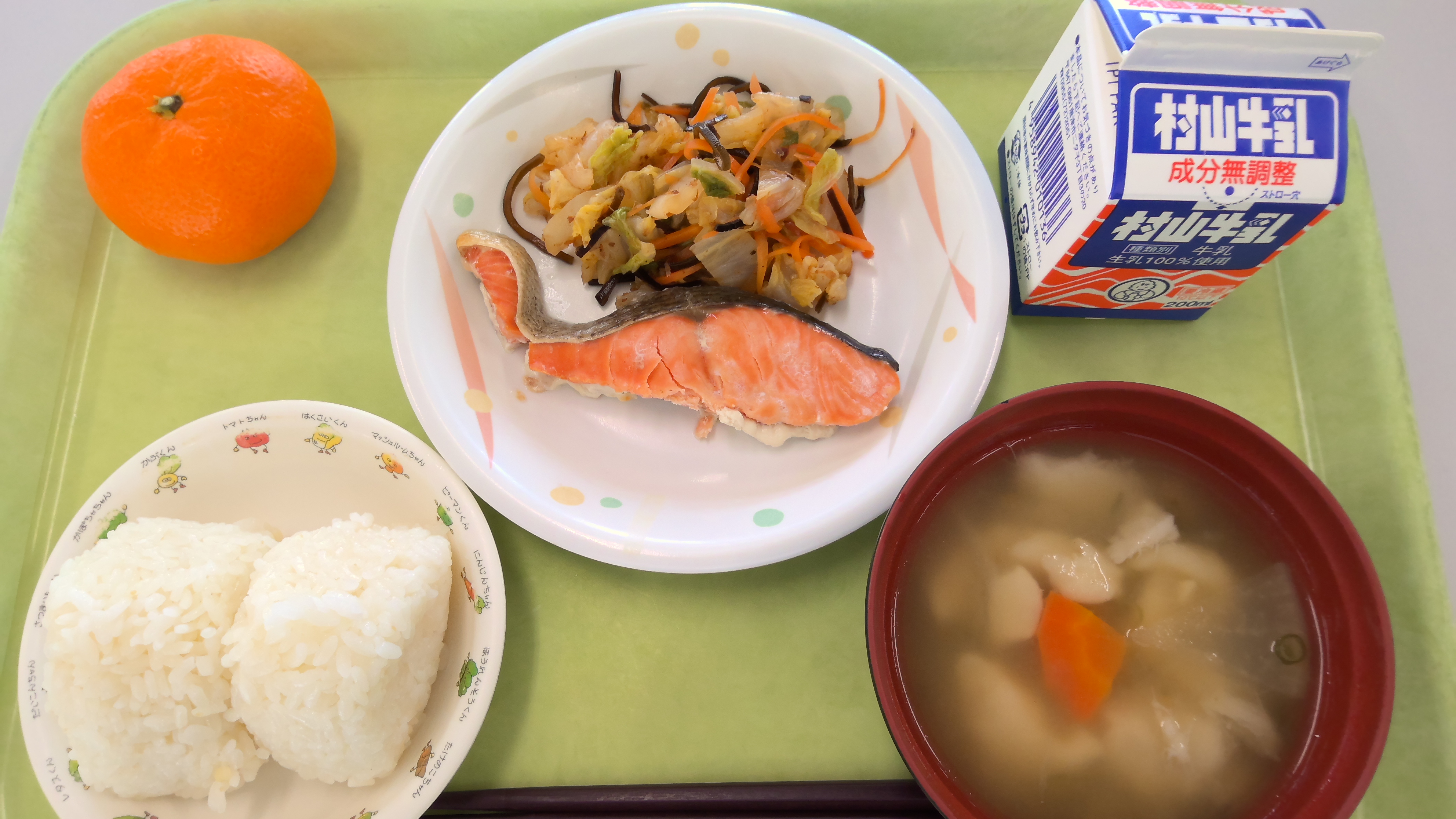 献立名:おにぎり、牛乳、鮭の塩焼き、菜の漬物(白菜の塩昆布あえ)、つんきぃーだご汁、くだもの(みかん)