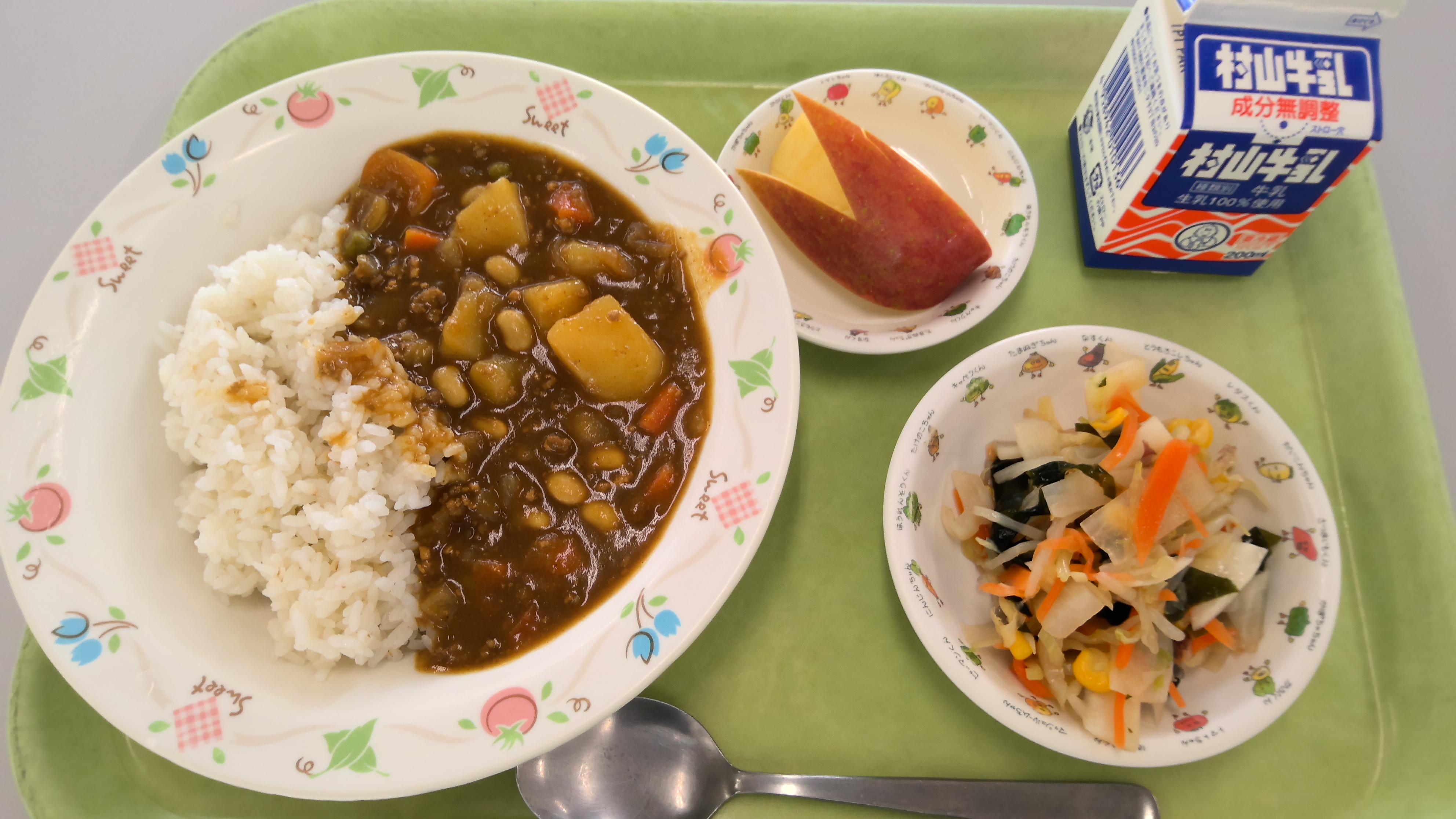 献立名:ひき肉と大豆のカレー(ラッキーにんじん入り)、牛乳、海藻サラダ、くだもの(りんご)