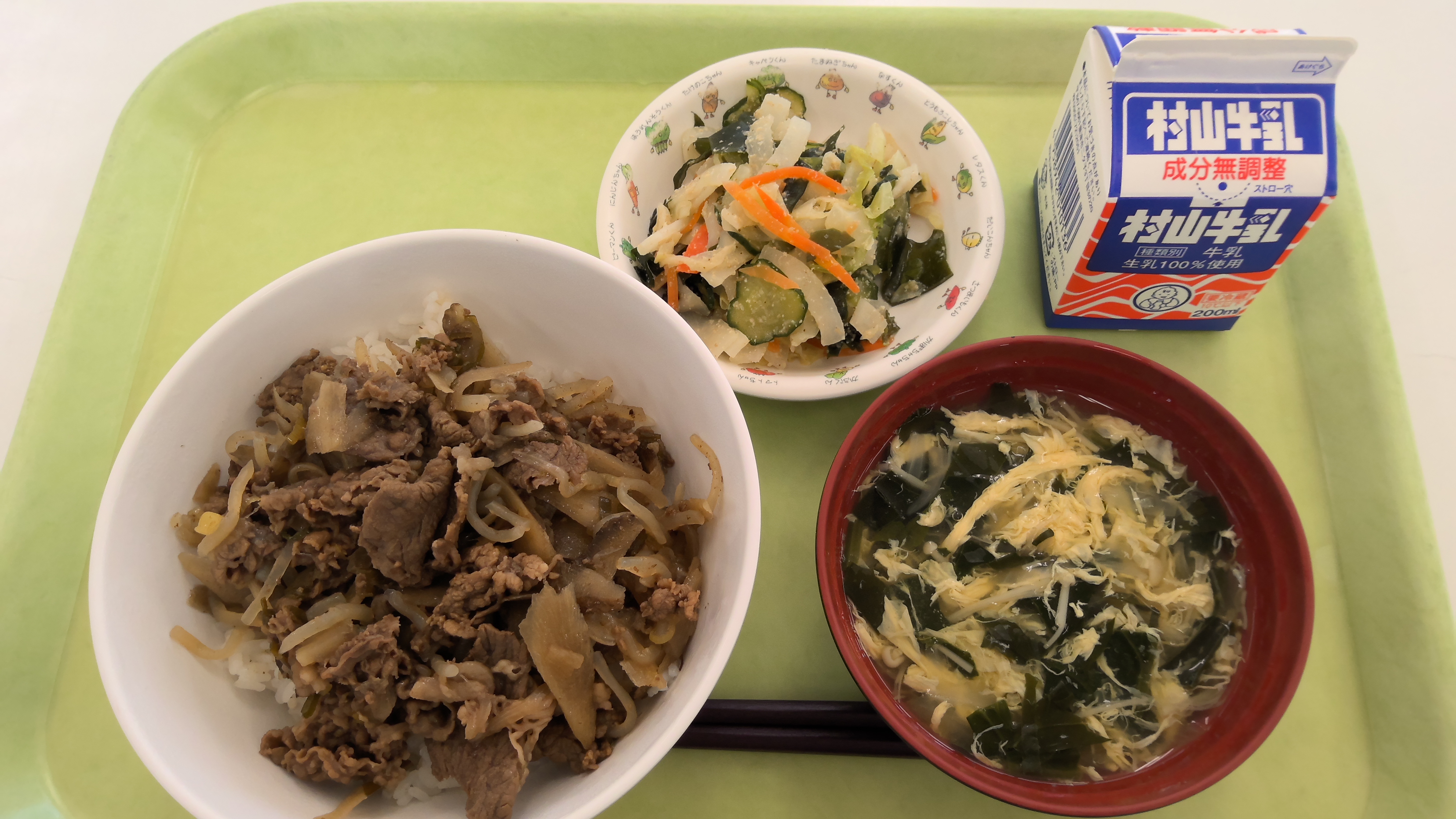 献立名:牛丼、牛乳、酢みそあえ、かきたま汁