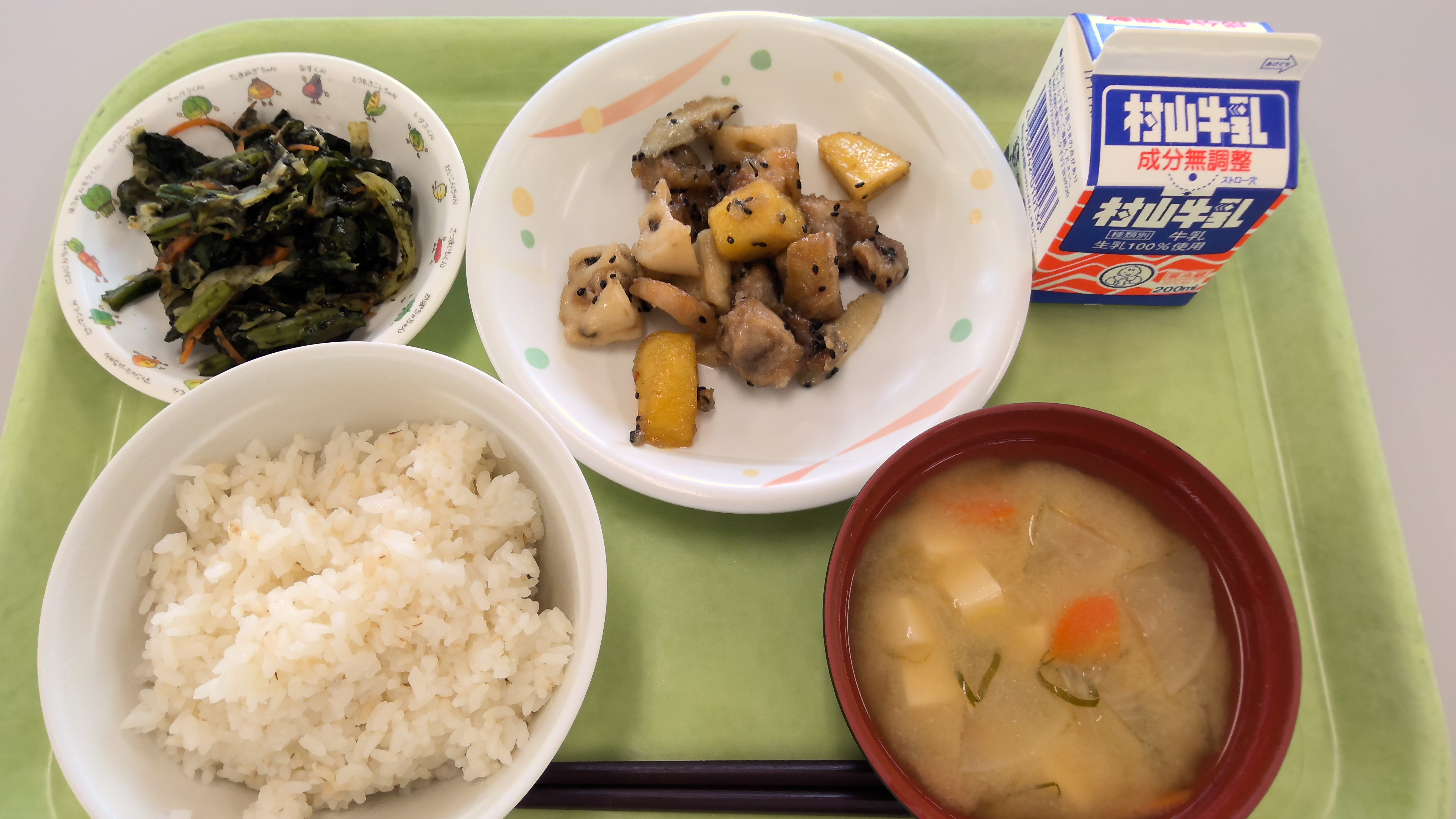 献立名:麦ごはん、牛乳、鶏肉と根菜の揚げ甘酢、磯香あえ、みそ汁